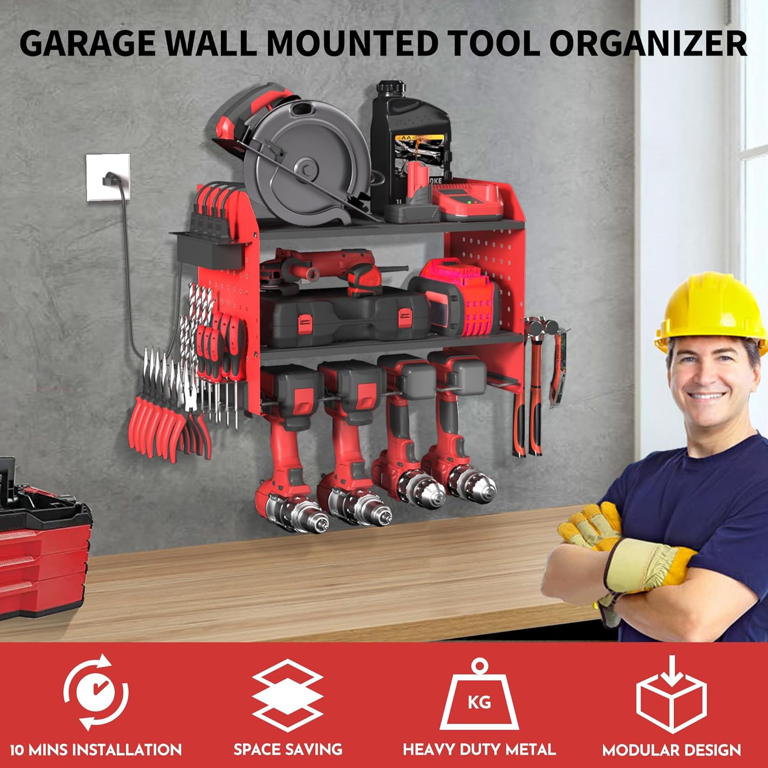 Power Tool Organizer Wall Mount – Adjustable Shelf, Side-Mounted 4-Outlet Charging Station | Heavy Duty Steel Drill Holder with Pegboards, Hooks & Drill Bit Rack for Garage & Workshop Storage(Red)