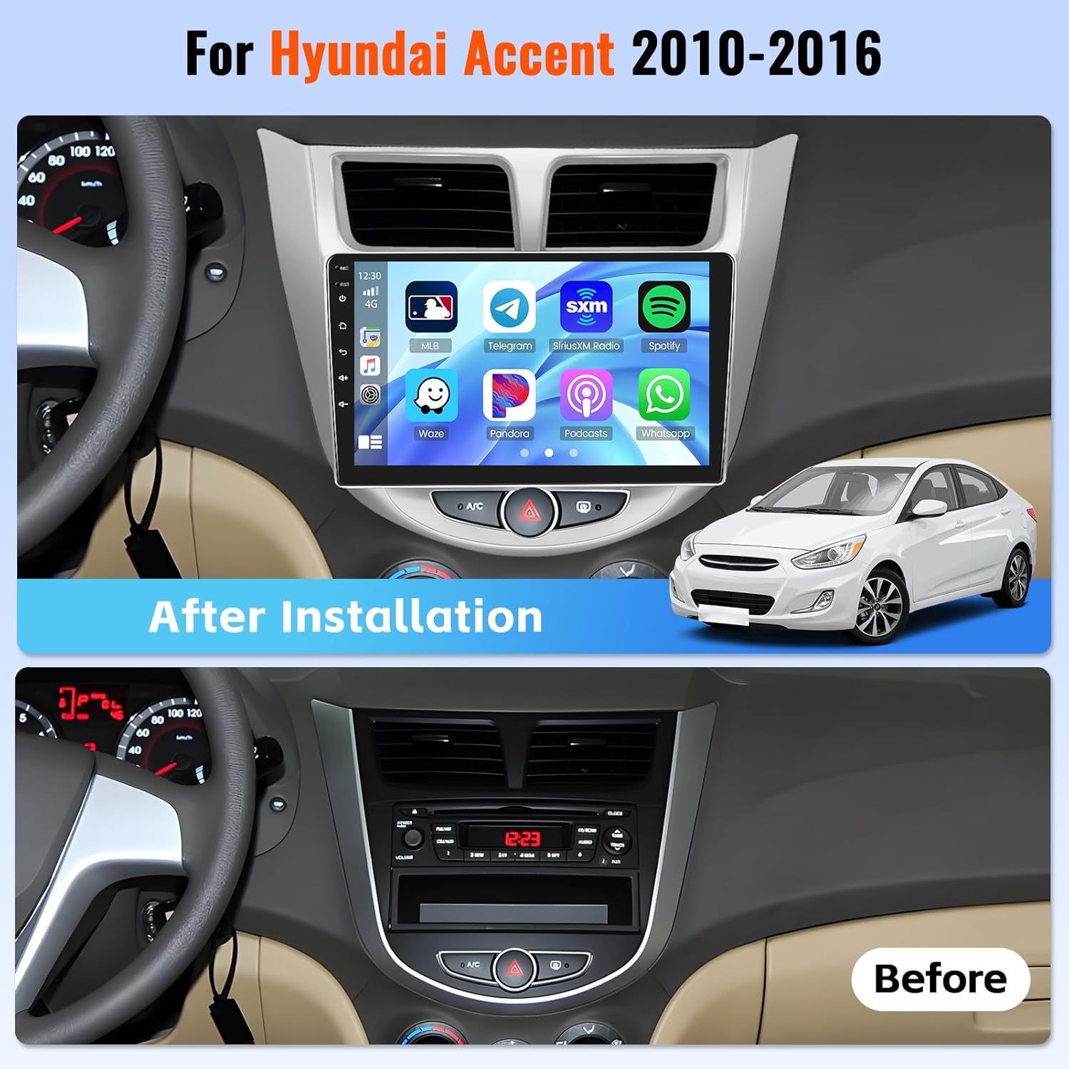 - Effortless Connectivity with CarPlay & Android Auto: This Android bluetooth touch screen car stereo for Hyundai Accent also supports wired and wireless CarPlay and Android Auto for easy access to your phone's apps. Activate voice assistants to manage navigation, calls, messages, music, and other functions hands-free