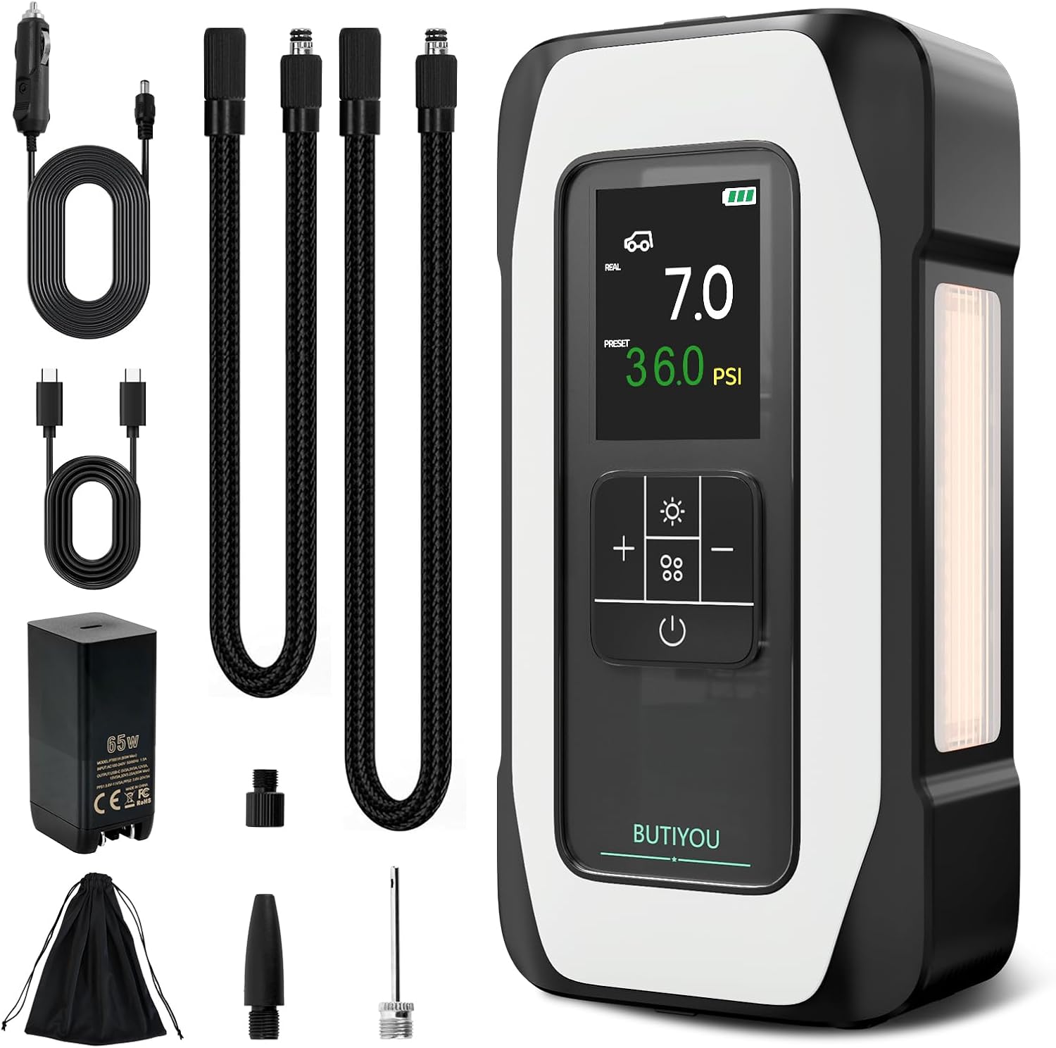 - 【Fast Inflation for Large Tires】The Butiyou BY01 portable tire inflator, designed for large tires, features dual air cylinders and a 16,000mAh battery for quick inflation, ideal for pickups, vans, large SUVs, cars and more.