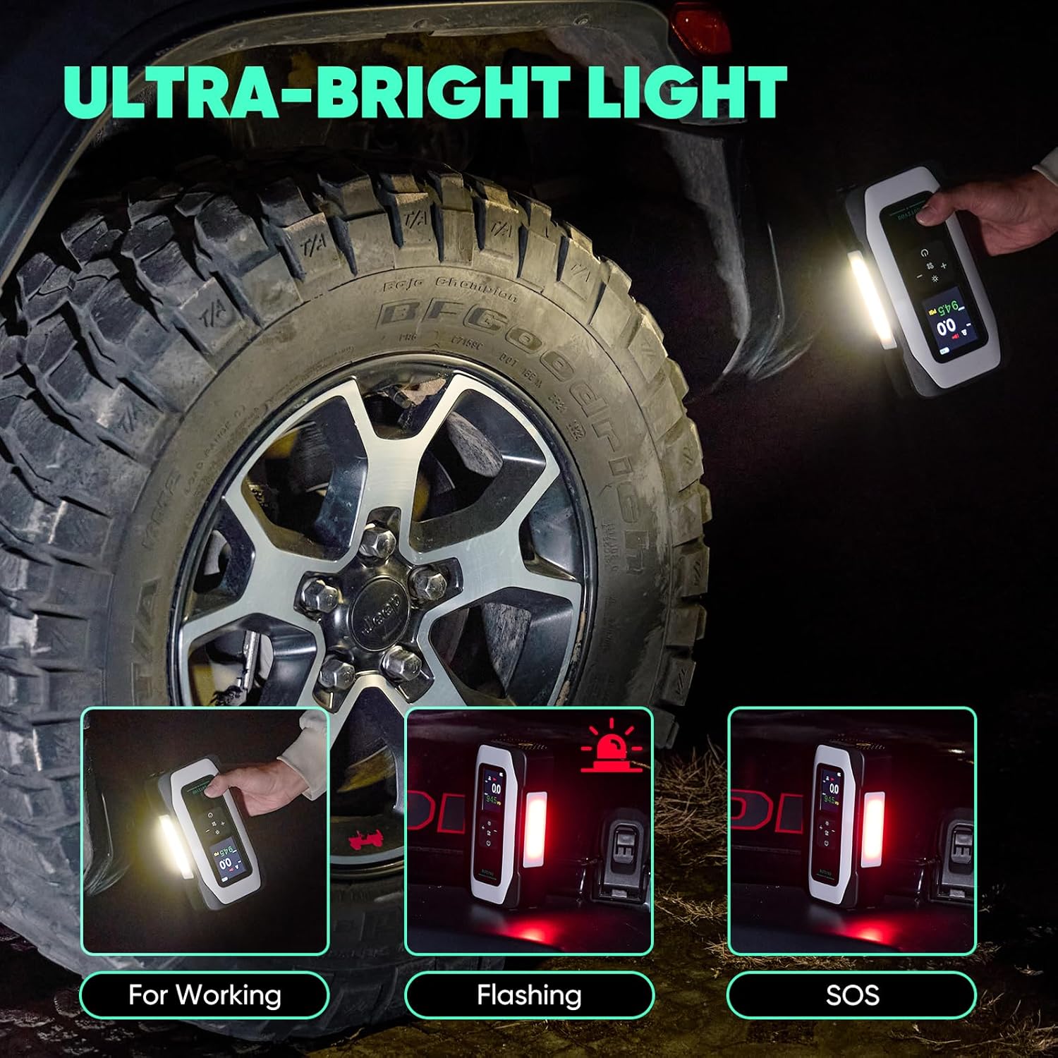 - 【High-Speed Charging】The 60W PD output allows for 4X faster charging. With the included 66W fast-charging PD charger, a 10-minute charge can inflate a tire immediately. Fully recharges in about 90 minutes.