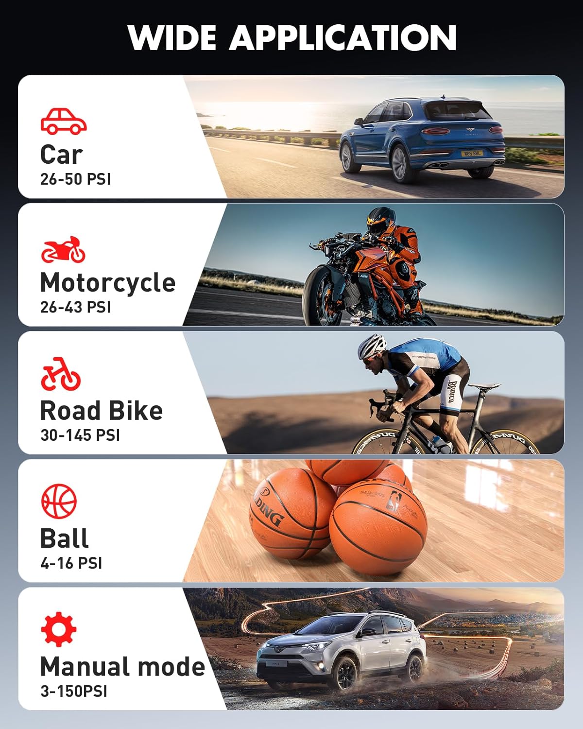 - đă5+ Mode & 3+UnitsTire Pumpă: Povasee portable tire inflator boasts four preset inflation modes tailored for bike, motorcycles, cars, and balls, you can setting the pressure (from 3 to 150PSI) to suit any inflation need. Effortlessly switch between three pressure units â PSI, KPA, and BAR â with a single button press, making mode changes a breeze. Operation is intuitive and streamlined.