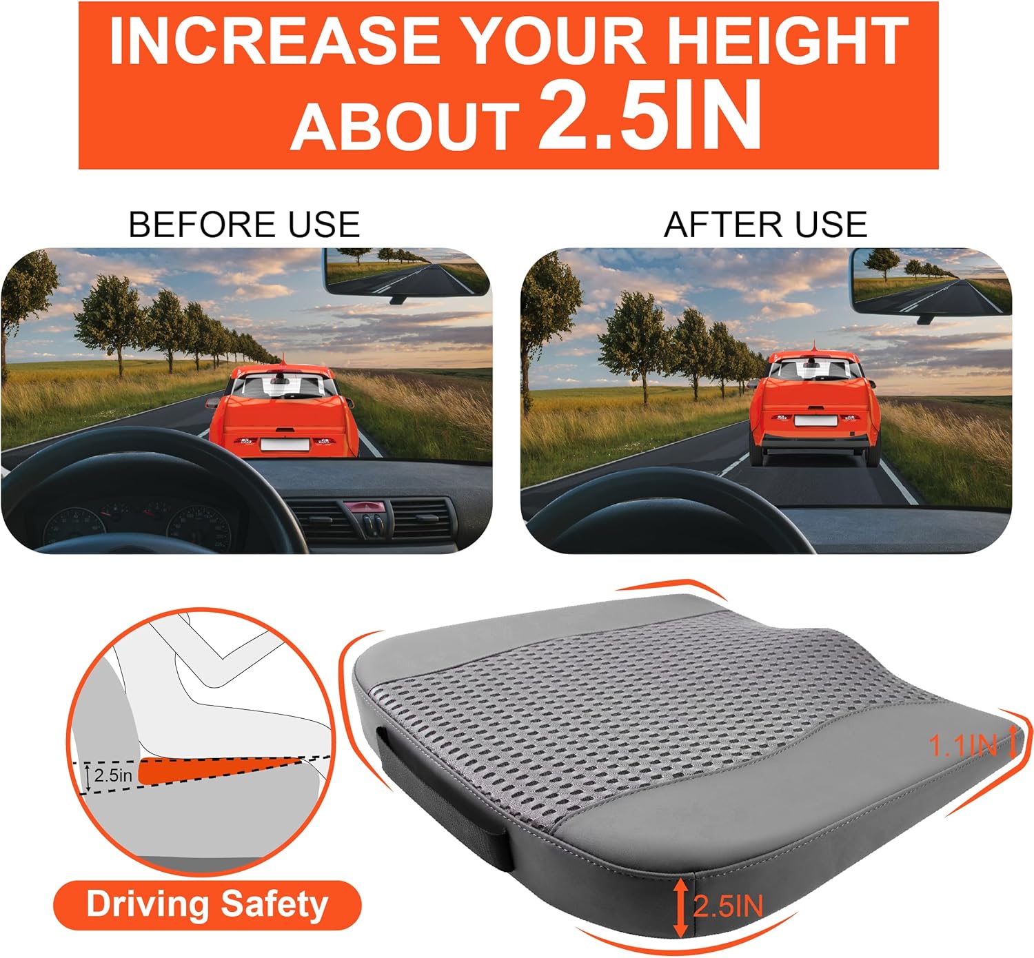 - ADDS HEIGHT BY 2.5 INCHES β Allows for increased vision of the front of your car and the road thanks to the car cushions for driving providing an additional 2.5β in height. Non-slip base keeps the car cushion firmly in place