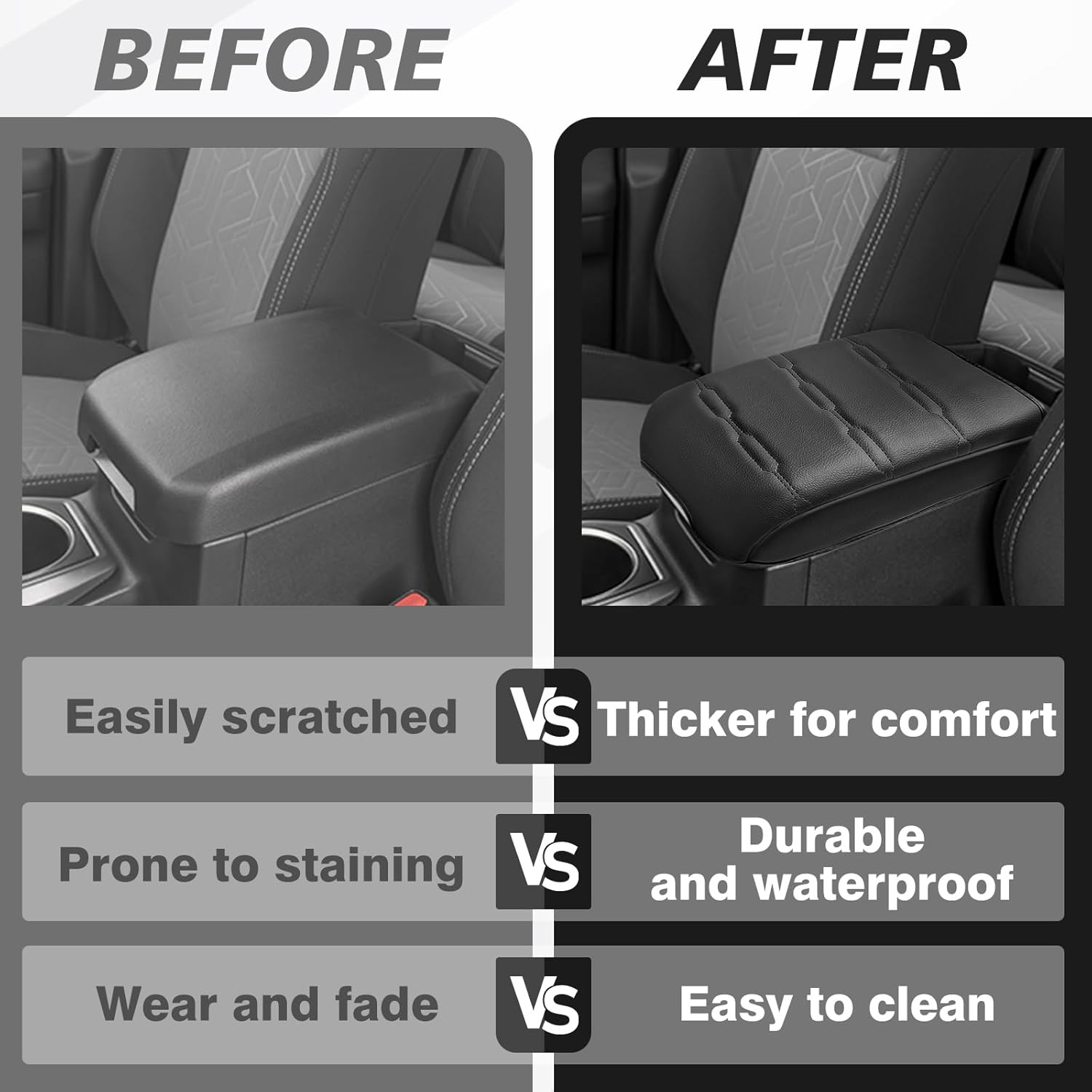 - Unique Design: Designed according to the OEM element to make it match your vehicle perfectly and even better. Our armrest cover is crafted with high-quality Vegan Leather, which is skin-friendly, breathable and soft.