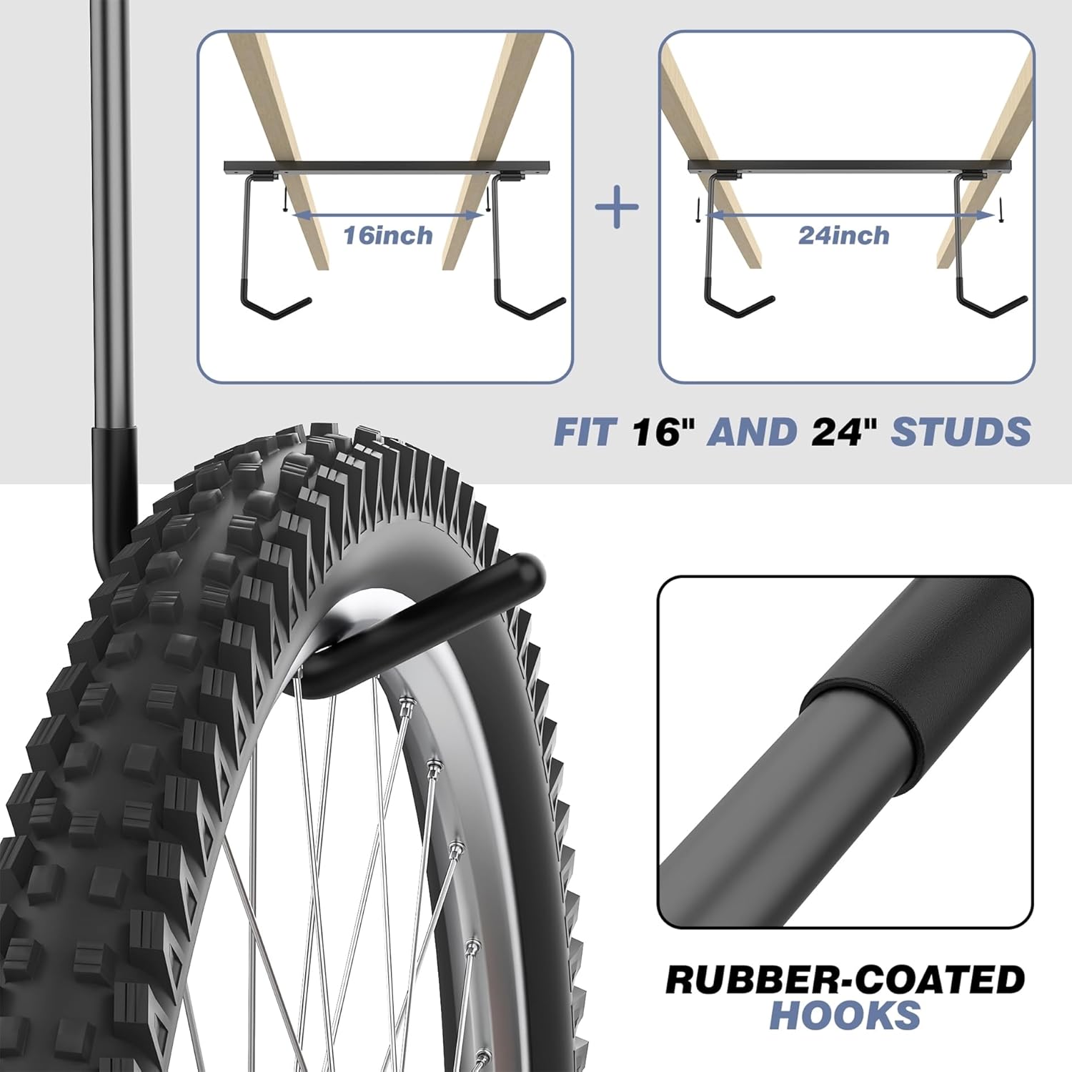 - Adjustable Rubber-Coated Hooks: The 11-inch long, swivel-adjustable hooks fit tires up to 3.5 inches wide, offering flexible storage for different bike sizes. Rubber coating ensures secure grip and protects rims from damage