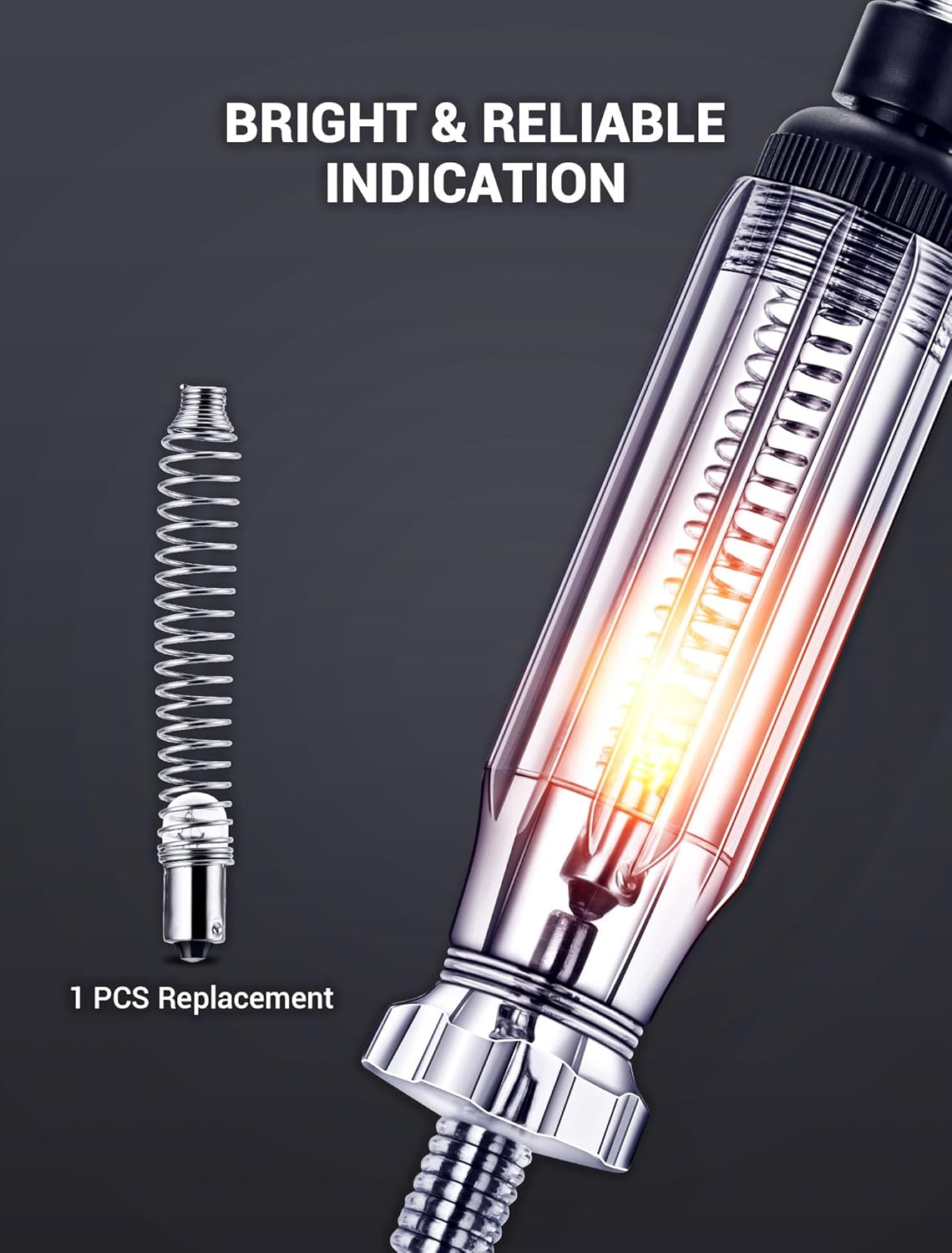 - 【Extra Spring Light Bulb】 : High visibility and strictly tested long service life spring test light bulb to indicate circuits’ signal. Can be used for common 6V-12V-24V DC circuit test; We throw in a replacement spring bulb as an extra to make