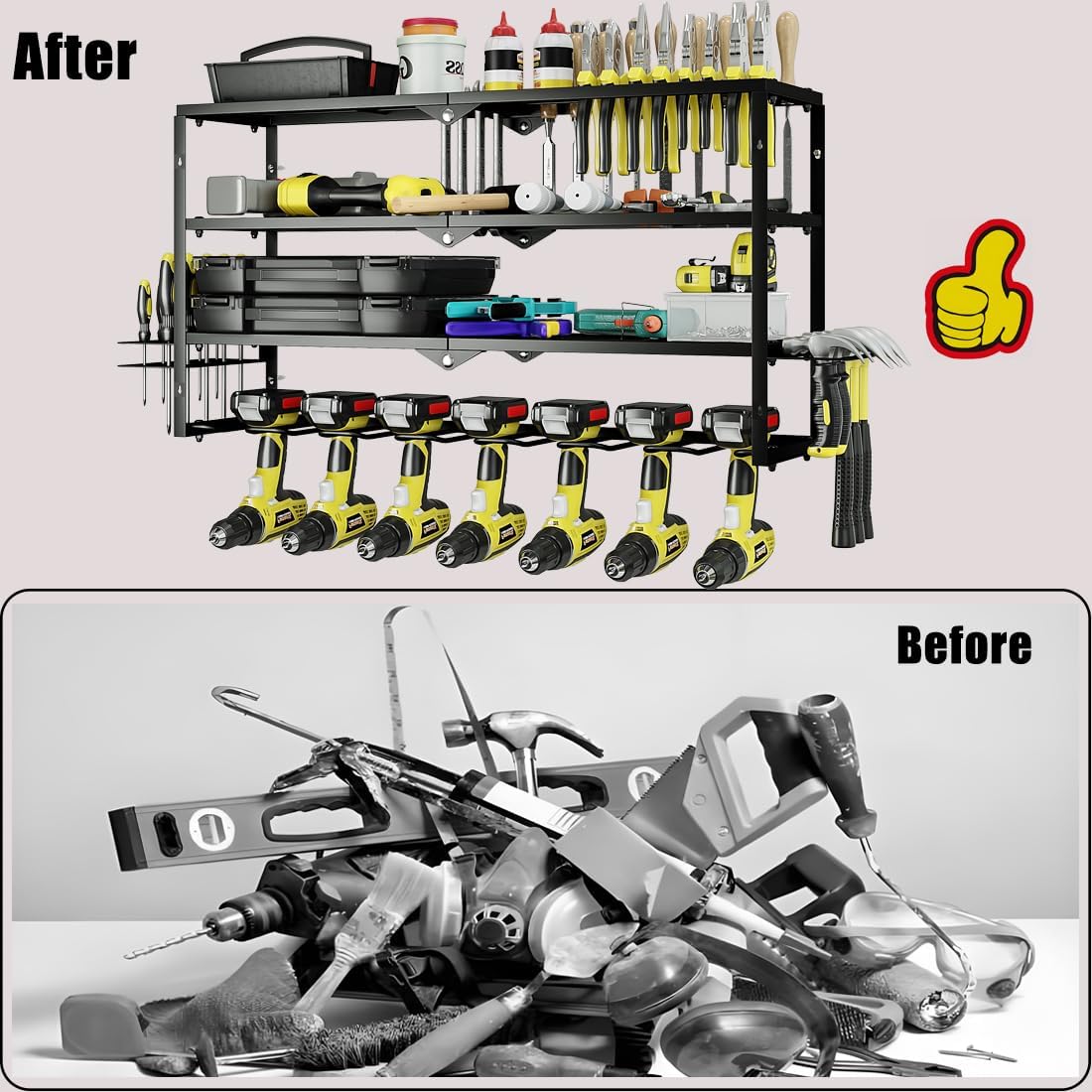 - Large Size: Your ultimate tool mate! 7 drill slots + 3-tier shelves & dual hooks organize all tools in one spot. Never waste time searching – enjoy a clean workspace that boosts efficiency!