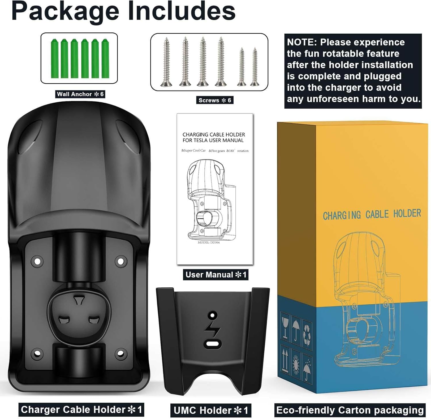 - Easy Installation: The Tesla wall charger holder can be installed in just a few minutes. Product includes 1 Tesla charger cable organizer, 1 UMC bracket, 6 screws, 6 wall anchors, and 1 user manual