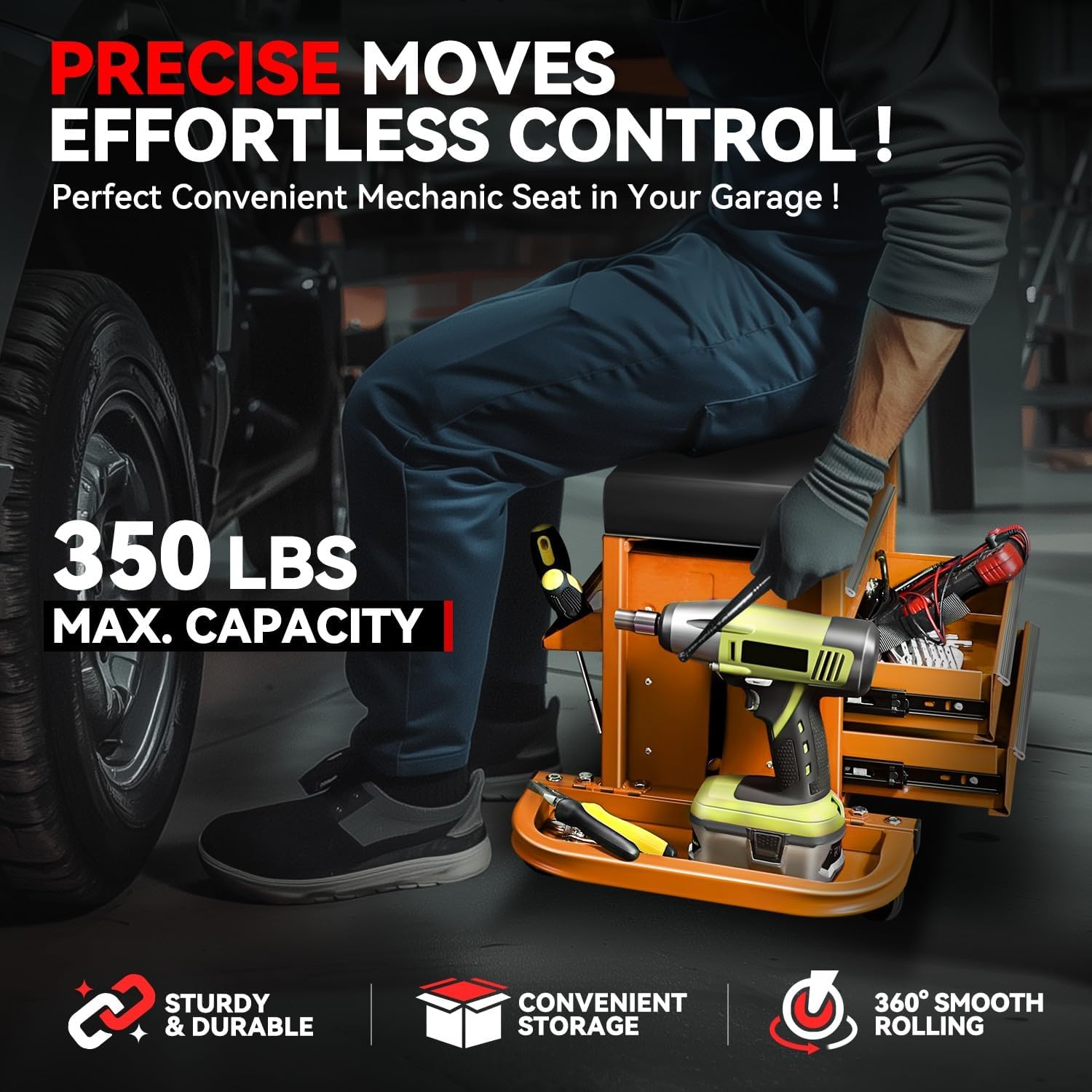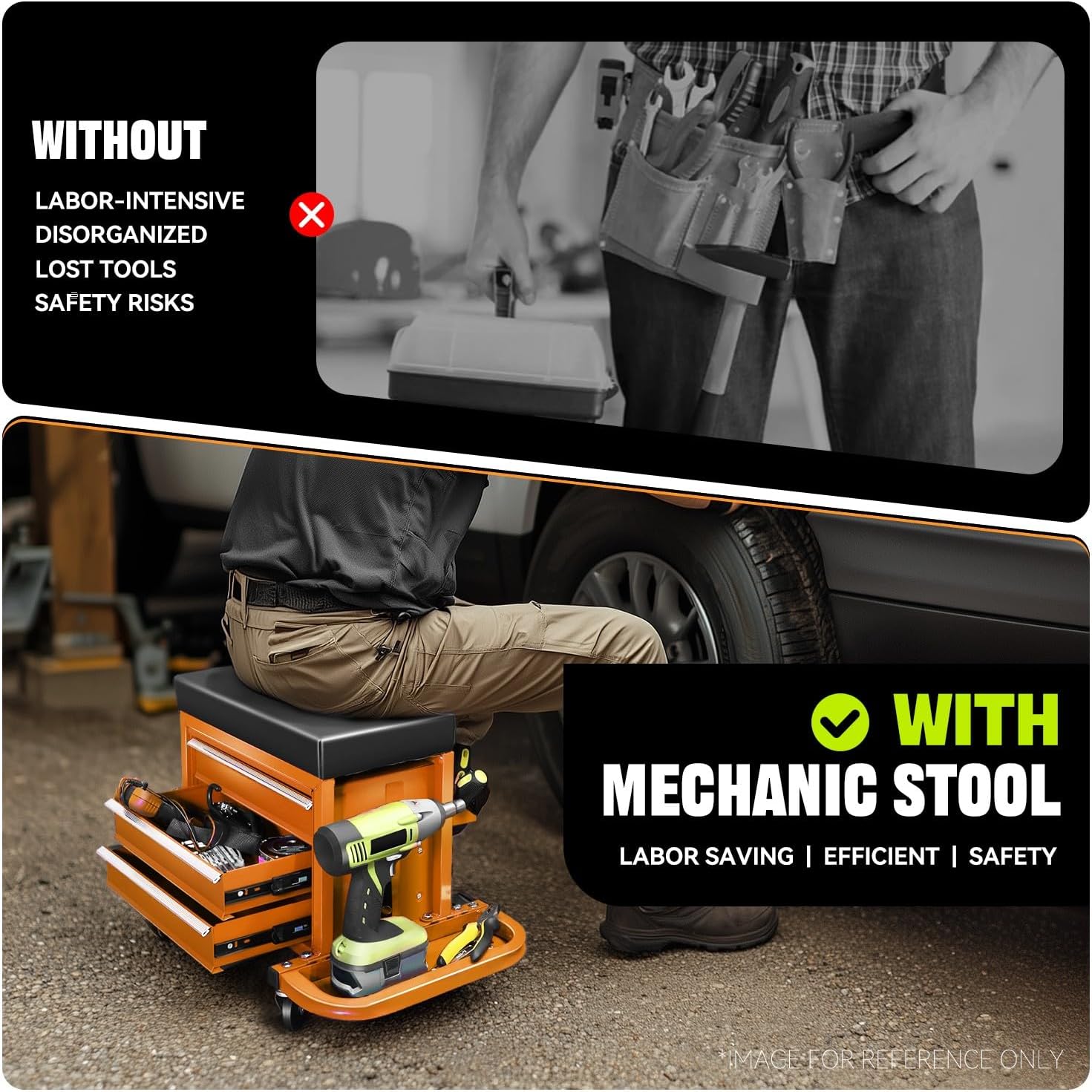 Auto Dynasty 3-Drawer Mechanic Rolling Seat, 350 LBS Capacity Roller Garage Shop Seat with Storage Tool Tray for Workshop, Repair Shop, Warehouse, Orange