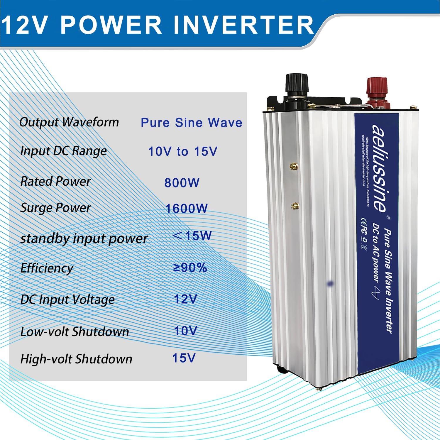 800W Pure Sine Wave Inverter-12V DC to 110V 120V AC Power Converter with 2 AC Outlets, 12 Volt Power Inverter for Truck, Rv, Camping, Home, Emergency Power