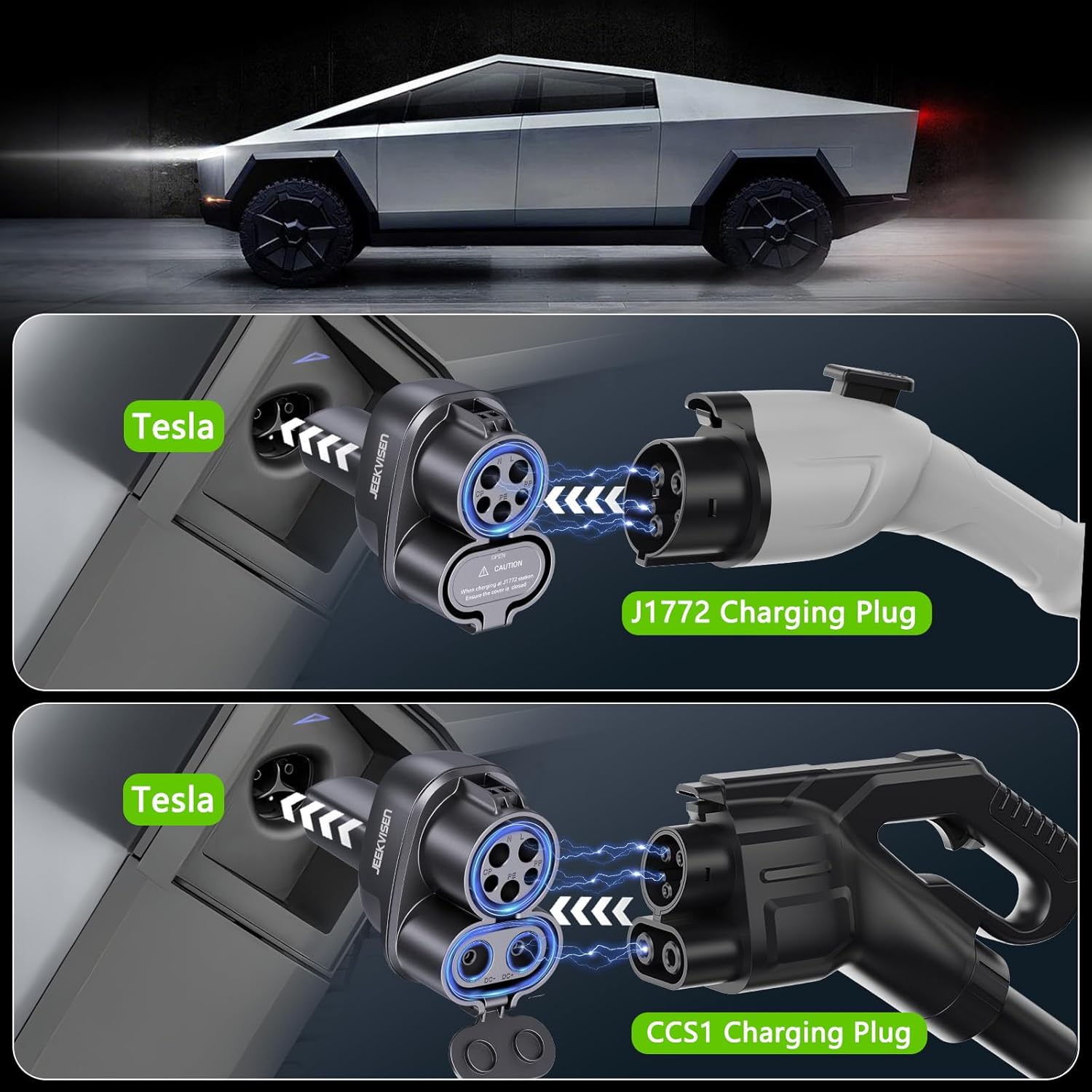 - Compatibility for Tesla and Cybertruck Charging Needs: The JEEKVISEN CCS & J1772 to Tesla Adapter supports seamless AC and DC charging for Cybertruck and Tesla Model Y/3/X/S, solving all your charging needs in one compact solution. Compatible with CCS1 and J1772 connectors, it works effortlessly with major networks like ChargePoint, EVgo, Blink, and Electrify America. Say goodbye to compatibility concerns and charge anywhere with ease