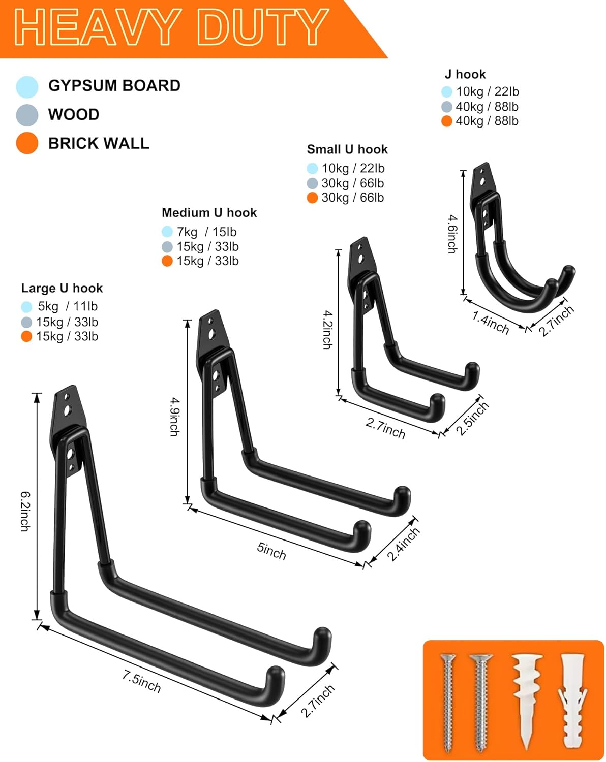 - Easy Installation: The garage hooks come with two types of screws, including 31 sets of screws and wall anchors, suitable for concrete walls, wooden walls, and brick walls.