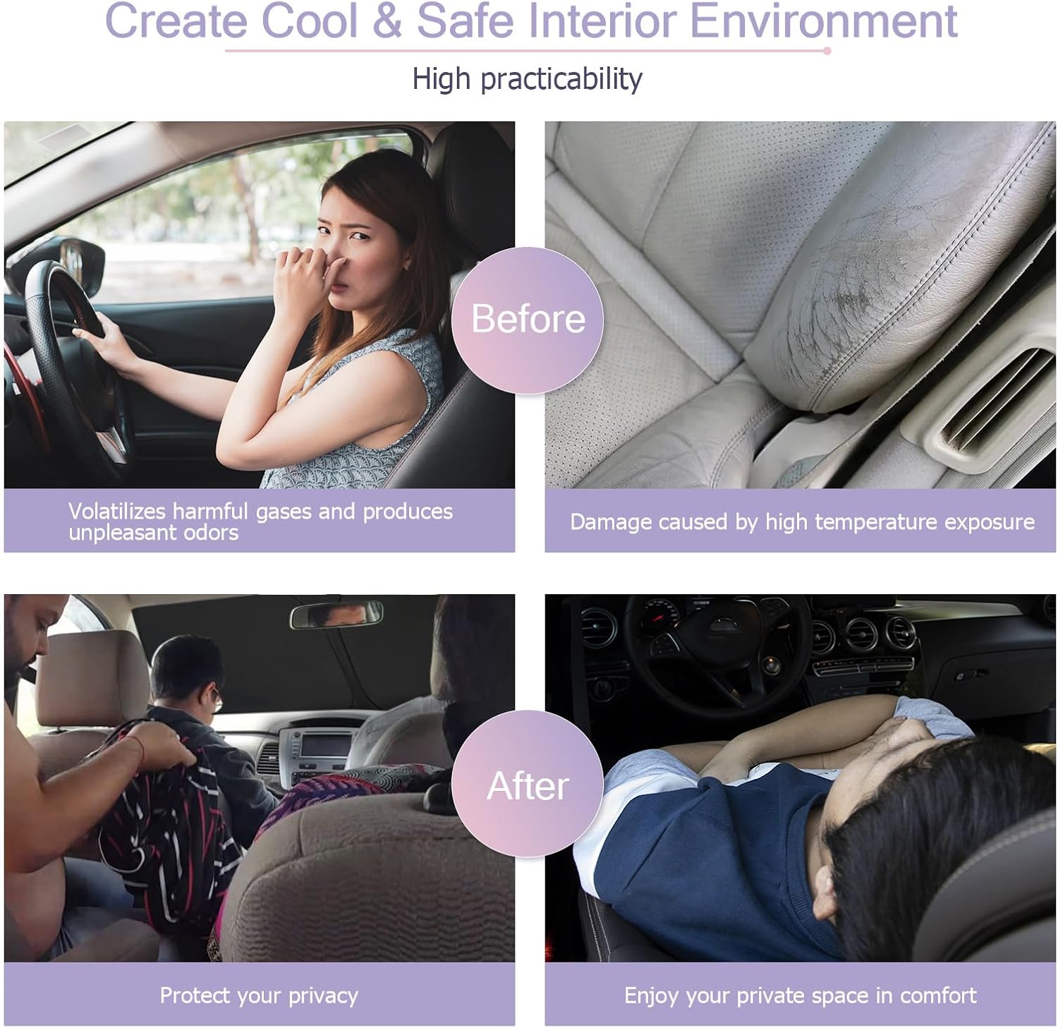 - 【Premium Protection】The windshield sunshade keeps your car internal relatively cool, effectively blocks sunlight, prevents harmful UV rays and heat from entering the car, and does not expose the steering wheel to strong sunlight for a long time, which can burn your hands. It can also protect car leather seats, instrument panels, display electronics, air outlets, etc. make them will not fade, crack, or fail