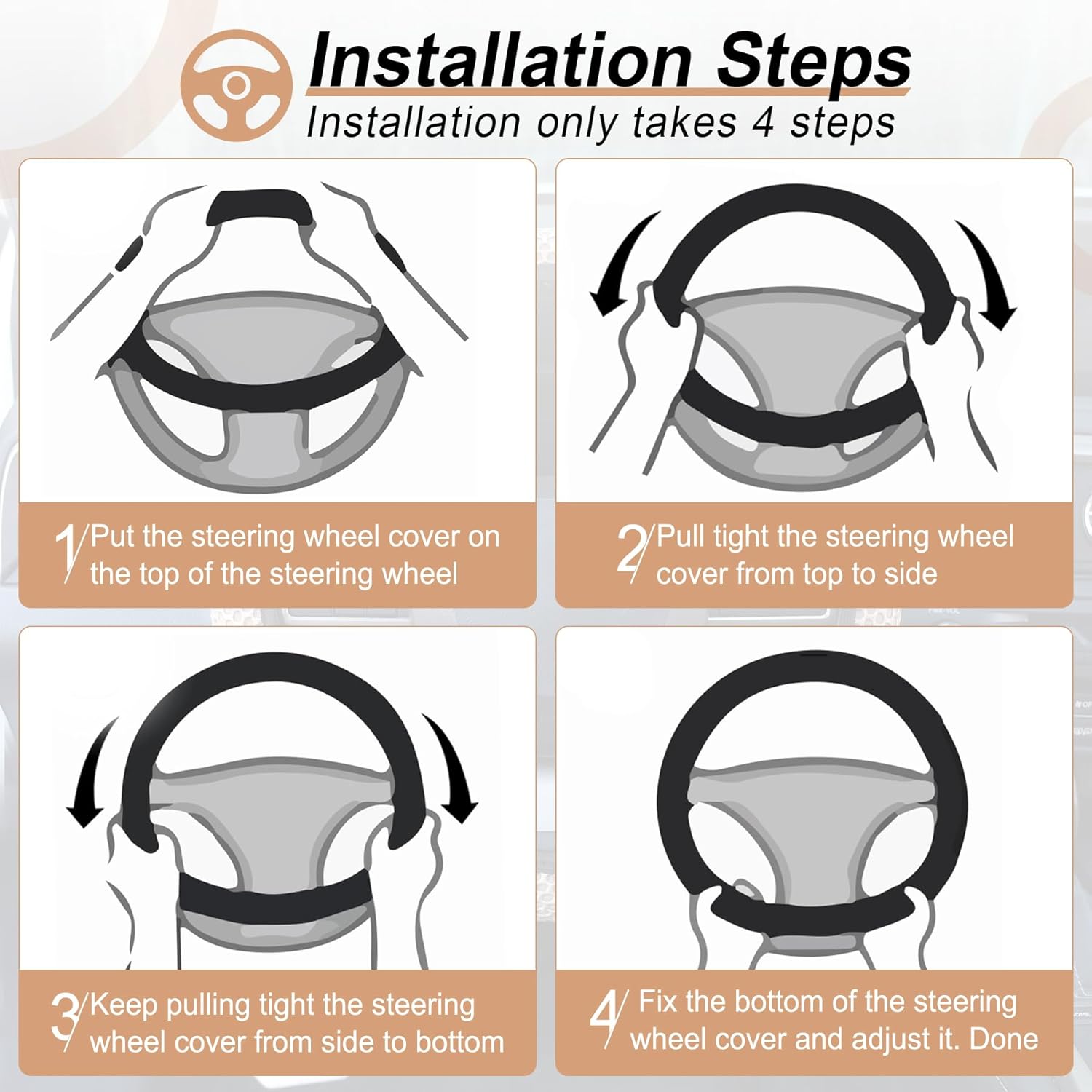 - 【Easy to install】: Because of the elastic stretch rubber band, Any adult can easy install this steering wheel cover, no tools required.