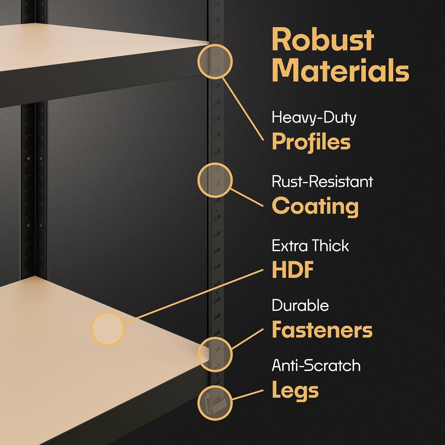 - PROPERLY STRONG AND DURABLE. Rely on this shelving to unfailingly hold your heavy possessions. All these metal shelves have extended profiles and rust-resistant coating. The heavy duty shelves themselves are extra thick HDF and come with robust bolts and rivets.