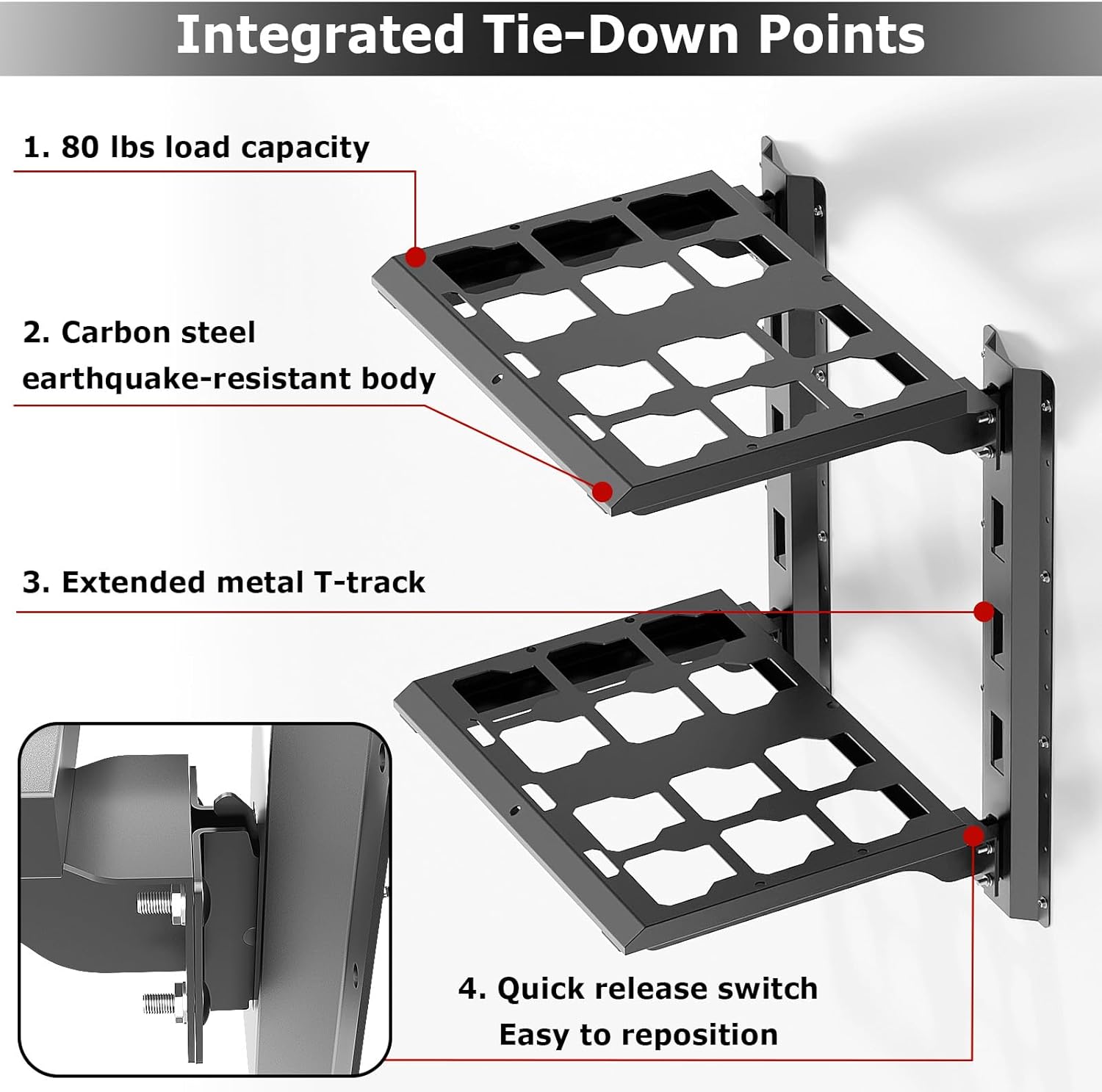 - Extended Track Design: Equipped with a sturdy metal frame and extended vertical E-tracks, from the traditional 20 inches to 23.6 inches, it can be adjusted up and down as needed, significantly increasing storage space. At the same time, it improves the durability and load-bearing capacity of the racking system, suitable for storing more goods or larger items