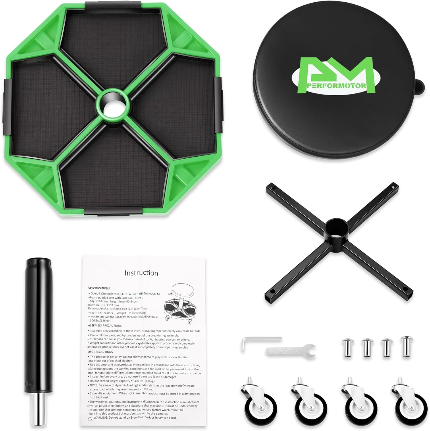 PM PERFORMOTOR Adjustable Height Pneumatic Garage Seat Rolling Mechanic Stool with Tool Tray Storage,300lbs Max Weight Capacity, Green,PM-TOL-ATS-GR