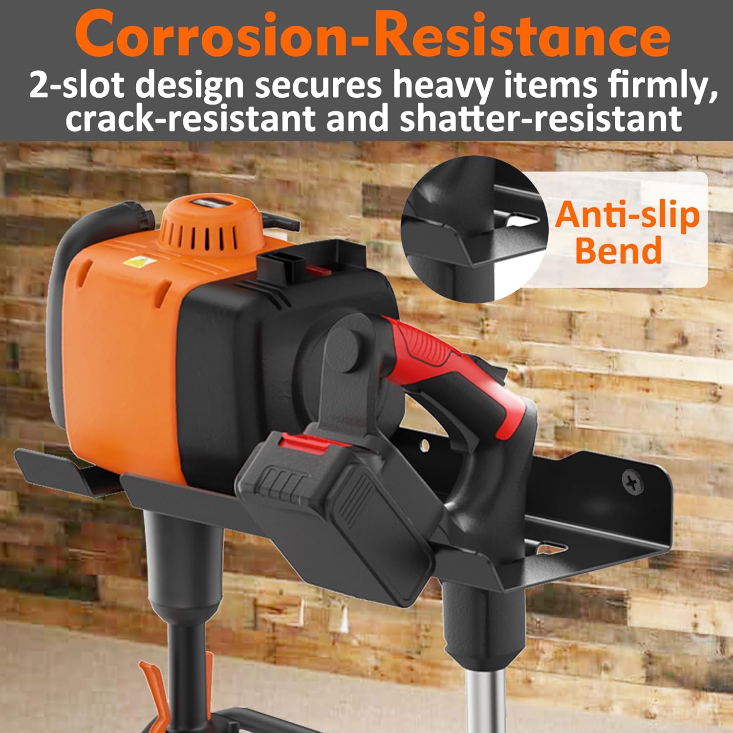 - Large Opening Weed Eater Rack: Smooth, flat panels with rounded edges prevent cuts and protect tools. The dual-slot design secures heavy items firmly, while rust-resistant, crack-proof materials ensure long-lasting durability