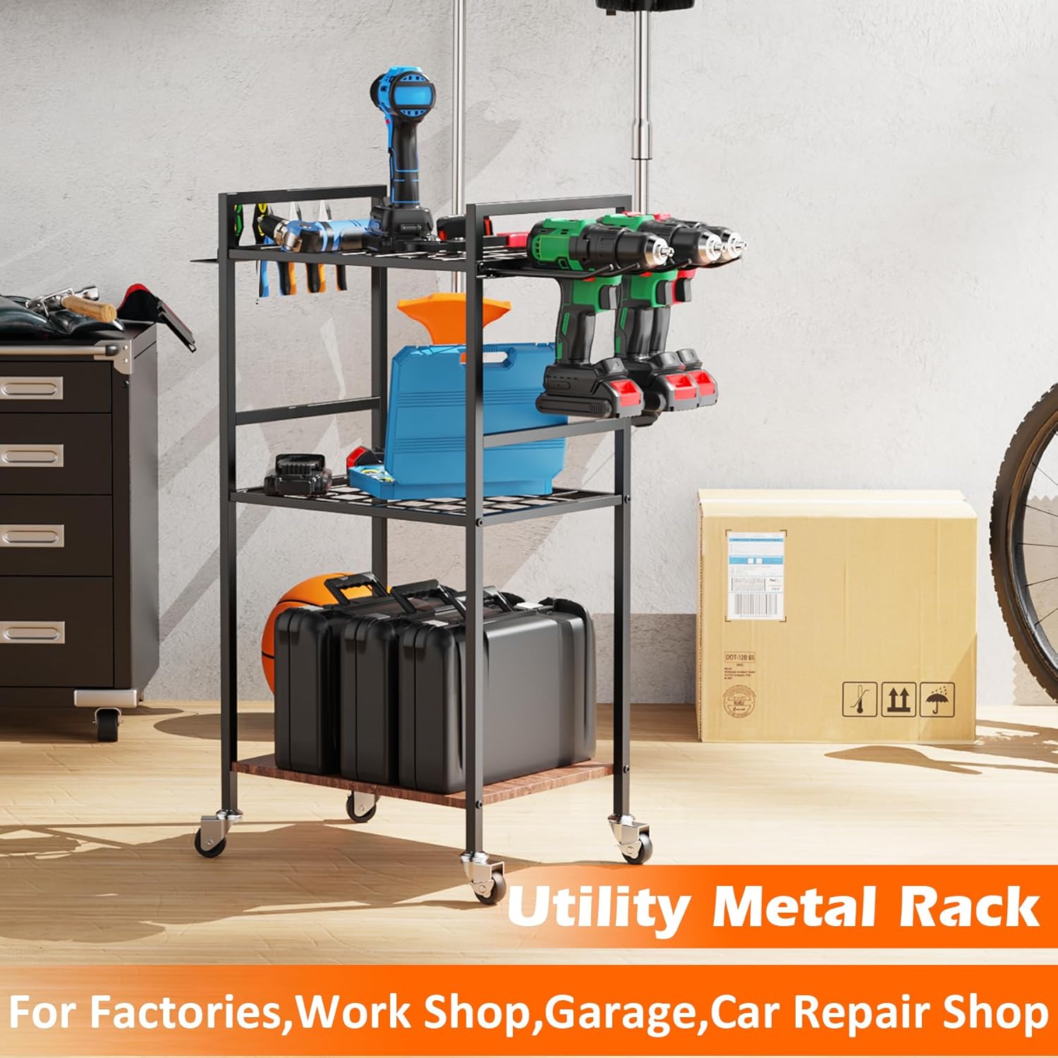 - Rolling Metal Tool Stand: Equipped with 360Β° wheels, making it easy to move around the garage or workshop. The wheels are designed to be sturdy and durable, allowing the cart to be moved with ease, and making it easier to access handy tools and equipment