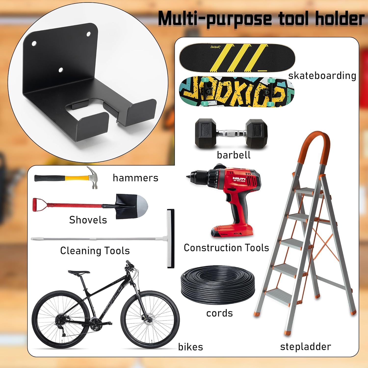 - 【Multipurpose Tool Hanger】The power tool hook is a flexible wall mounting solution, mount it in your garden, yard, shed or garage as you wish. Perfect for hanging various garden tools or power tools especially like string trimmers, weedeaters, power drills, gas edgers, chainsaws, blowers and lawnmowers, or garden tools like shovels, ladders, mops, brooms, hoses, snow shove, sports equipment, bicyclesor any hangable items, and work great.