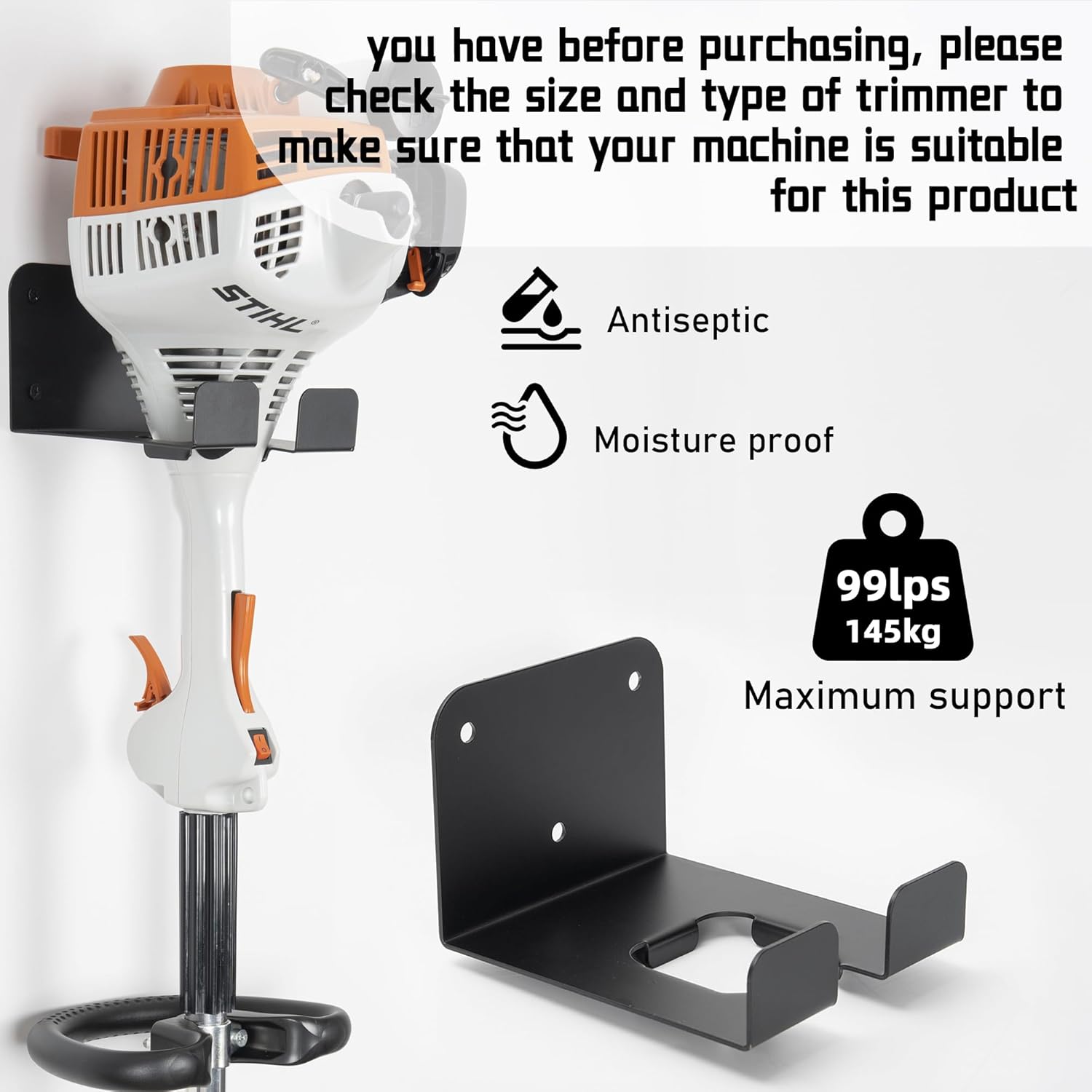 - 【Sturdy & Premium Materials】The weed eater hanger is made of thickened stainless steel, which is stronger and has high bearing capacity. The surface of the racks is sprayed with black paint for double protection. Waterproof and anti-rust, wearproof, resistance to chipping and cracking. Smooth edge cutting does not hurt your hands and tools. Its robust design ensures that your power tools are held securely in place, preventing accidental damage or falls!