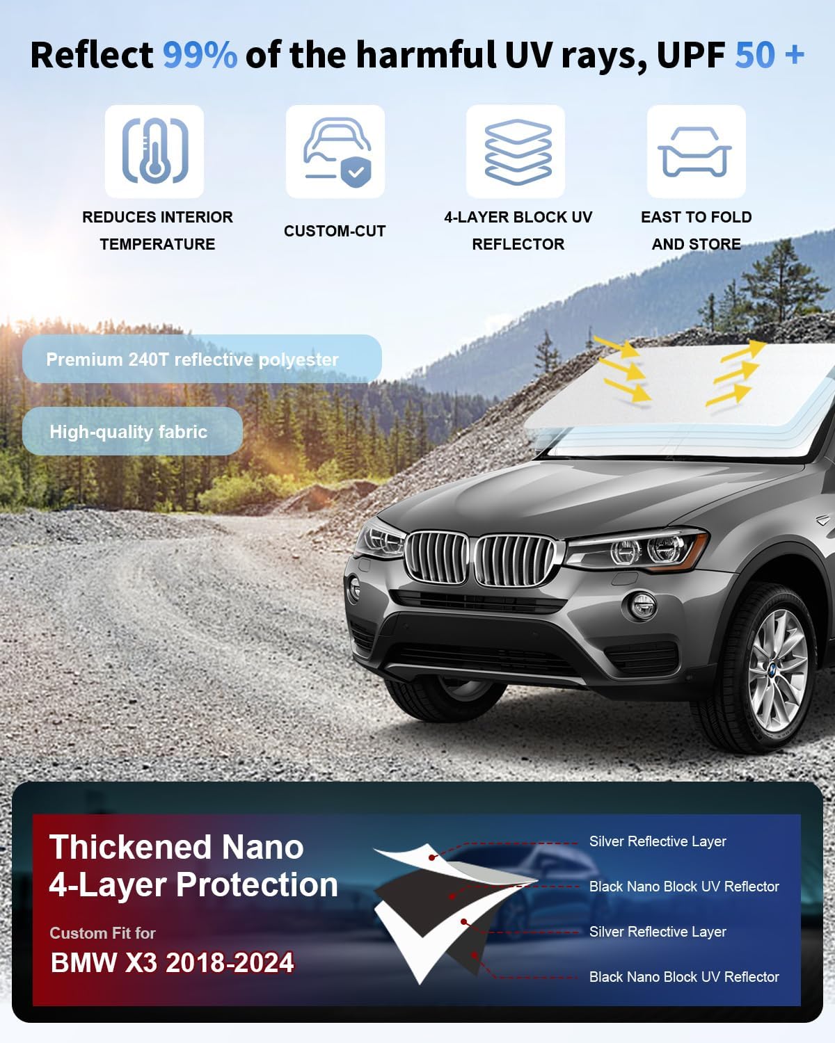 - [VEHICLE SPECIFIC] SLOGENTO Windshield Shade custom fit for 2018-2024 BMW X3 ,Full covered your windshield,No Gap,100% Perfect fit.