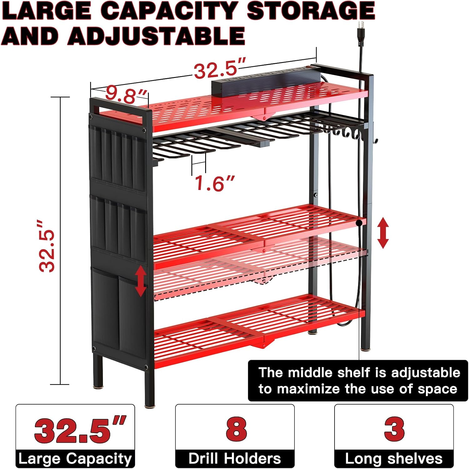 - Holds Up to 8 Drills – This tool organizer rack offers ample storage, holding up to 8 drills at once. Whether it’s a cordless drill holder or other power tools, you’ll have everything neatly stored and within reach