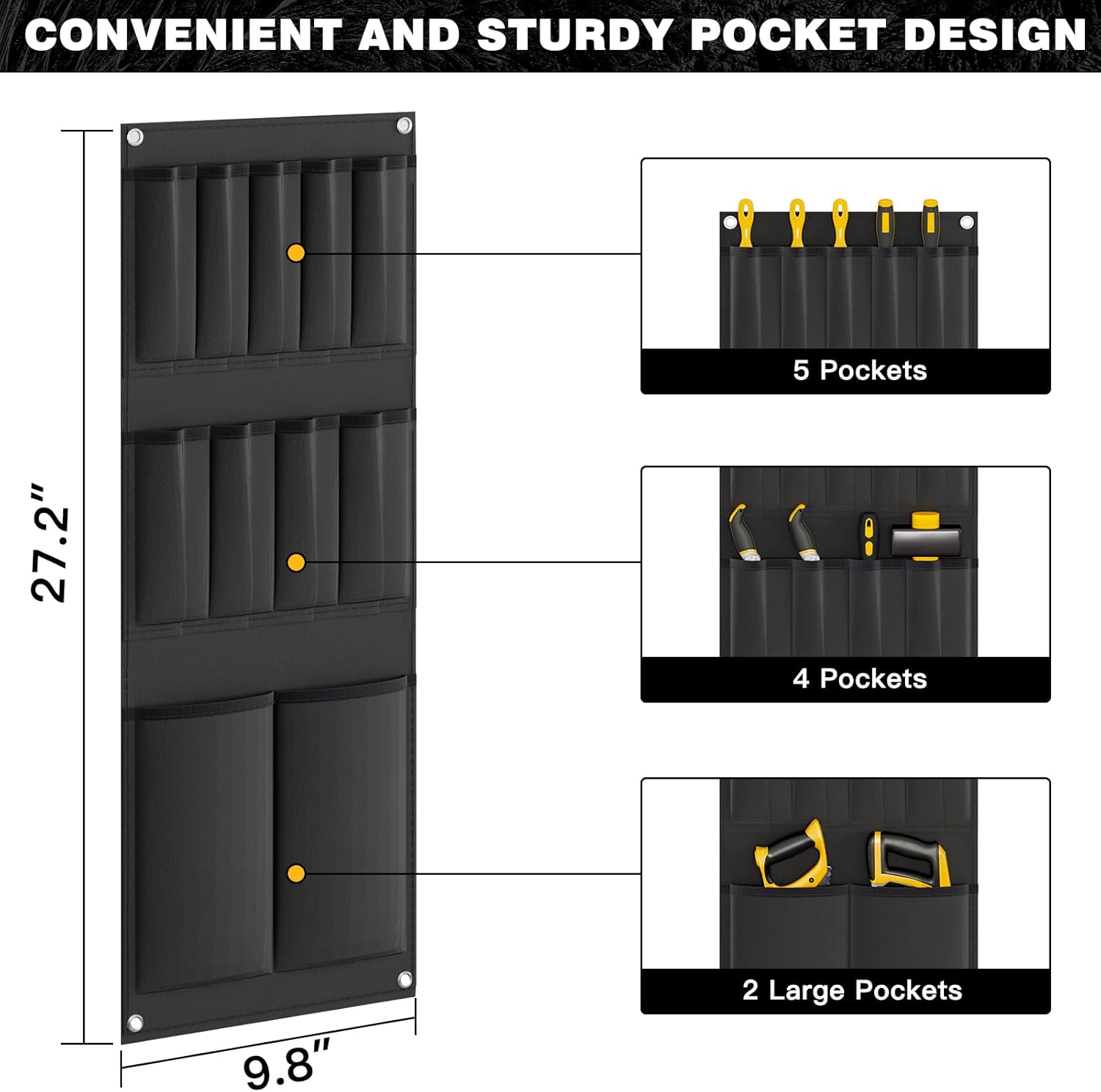 - Convenient Side Pockets for Small Tools – Equipped with side pockets of various sizes, this tool organizer and storage solution keeps your smaller tools, like hammers and screwdrivers, neatly organized and easy to grab