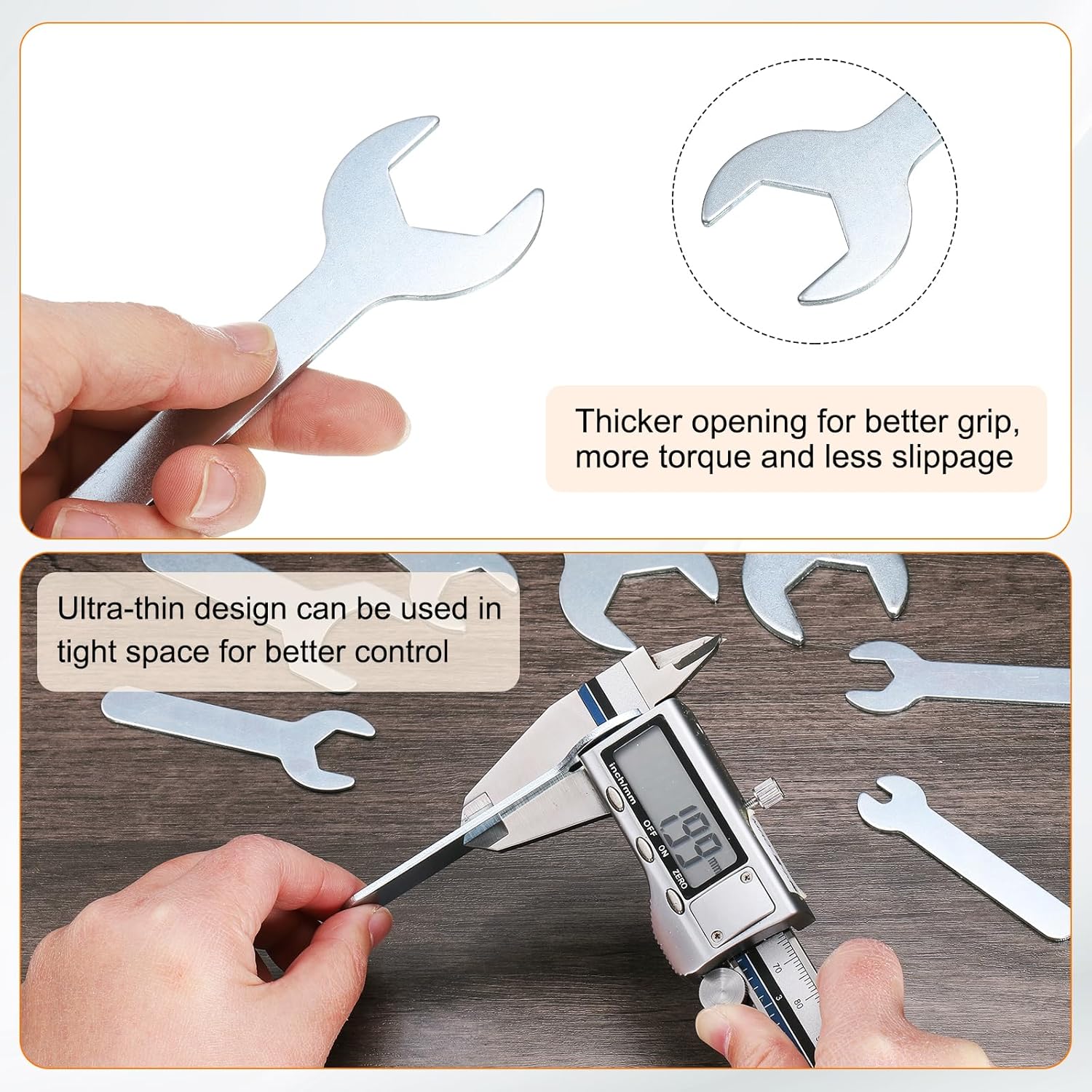- Size - Open end: 24mm / 0.95"; Open outside width: 40.5mm / 1.59"; Total length: 115mm / 4.53"; Stem thickness: 2.8mm / 0.11"; Stem width: 12.3mm / 0.48"; Color: Silver-grey; Package includes: 10 x Single open-end wrenches. The open wrench set is thin enough to work on tight spots.