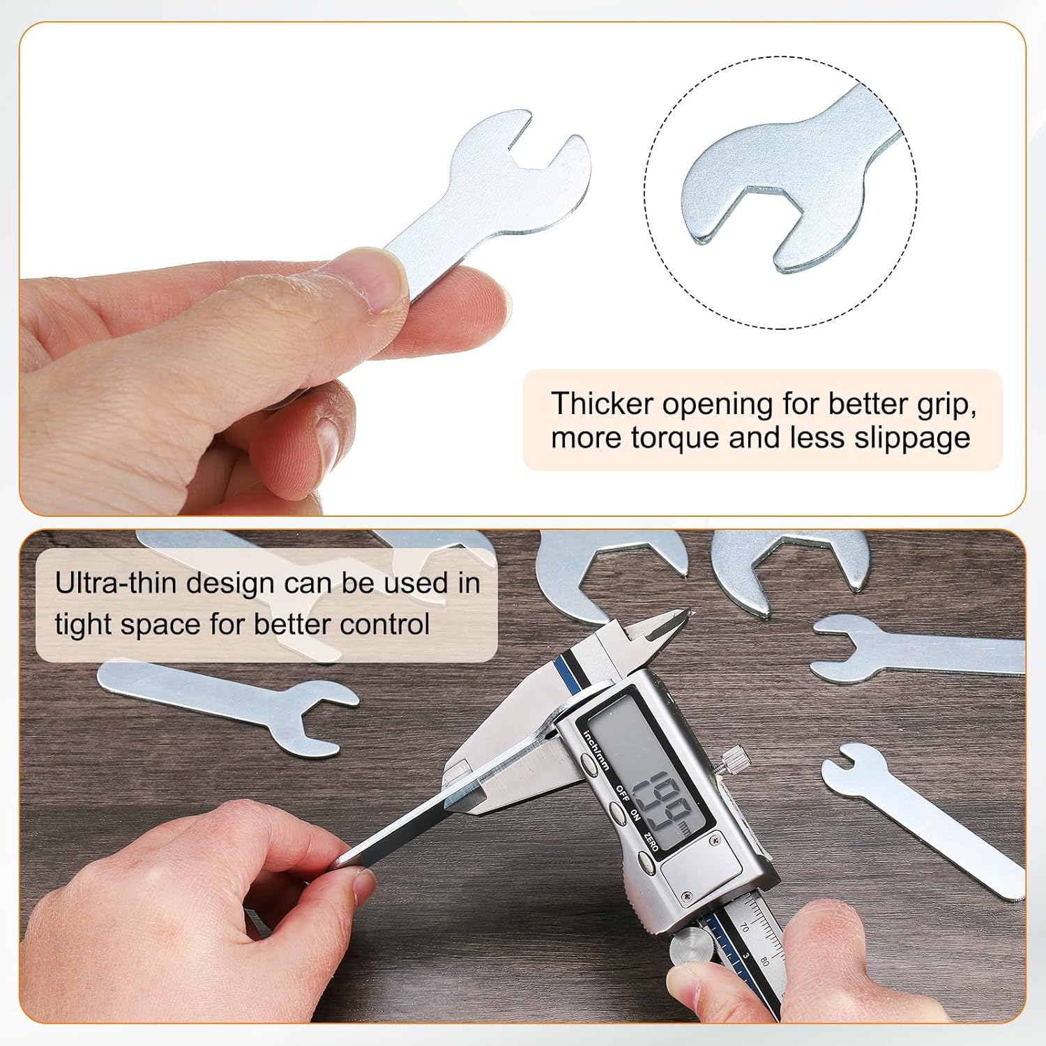 - Size - Open end: 8mm / 0.32"; Open outside width: 22mm / 0.87"; Total length: 70mm / 2.76"; Stem thickness: 1.8mm / 0.07"; Stem width: 9mm / 0.35"; Color: Silver-grey; Package includes: 10 x Single open-end wrenches. The open wrench set is thin enough to work on tight spots.