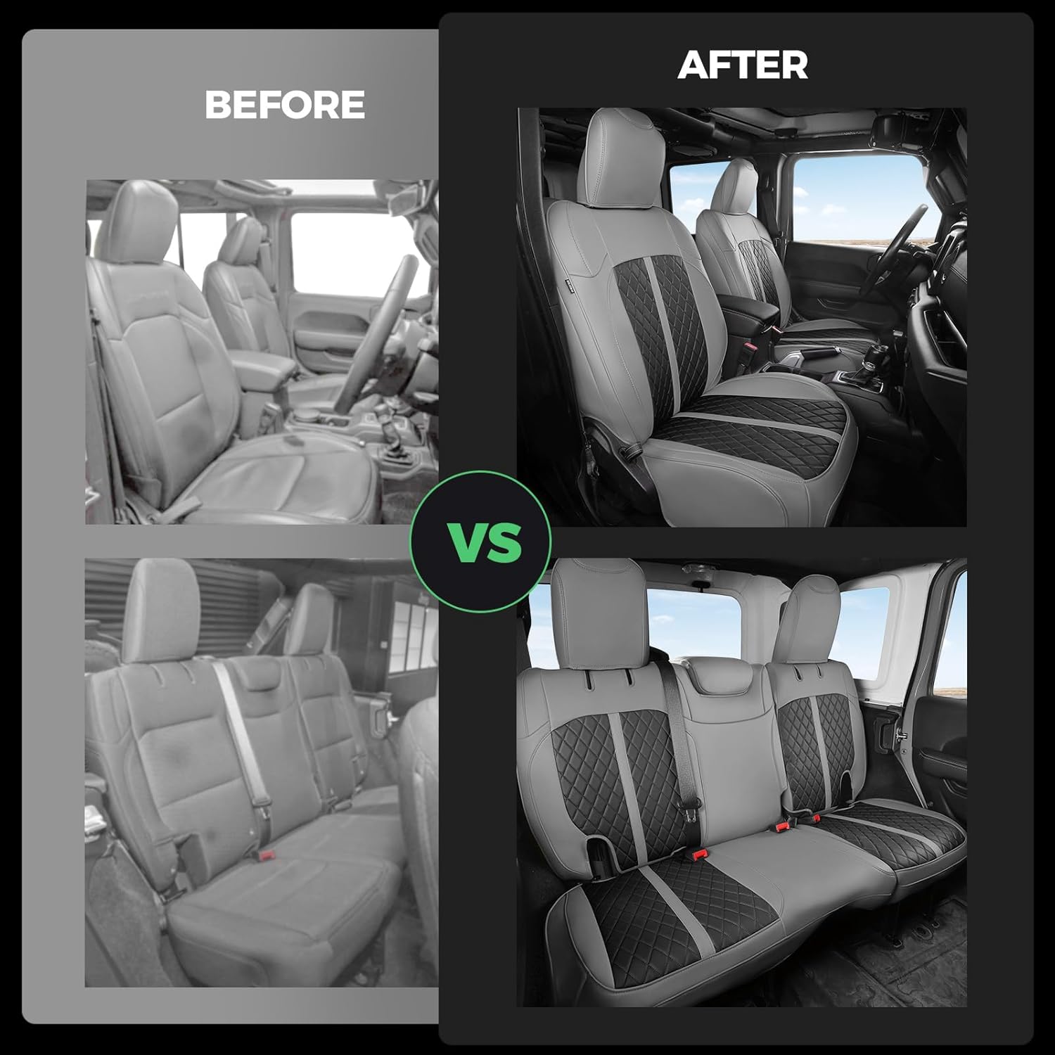 - ăSuperior Car Seat Protectoră: These waterproof seat covers for Jeep Wrangler 4 Door JL adopts a four-layer structure, providing exceptional protection capabilities to safeguard your car seats from coffee spills and pet scratches. It is also easy to clean, simply wipe with damp cloths to make your waterproof car seat cover looks brand new for years.