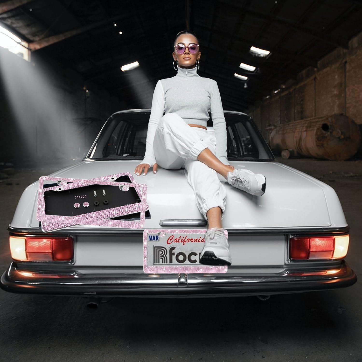 2 Pack License Plate Frames for Women, Sparkly Rhinestone Diamond Car Accessories with Glitter Crystal Caps (Pink (2PCS))