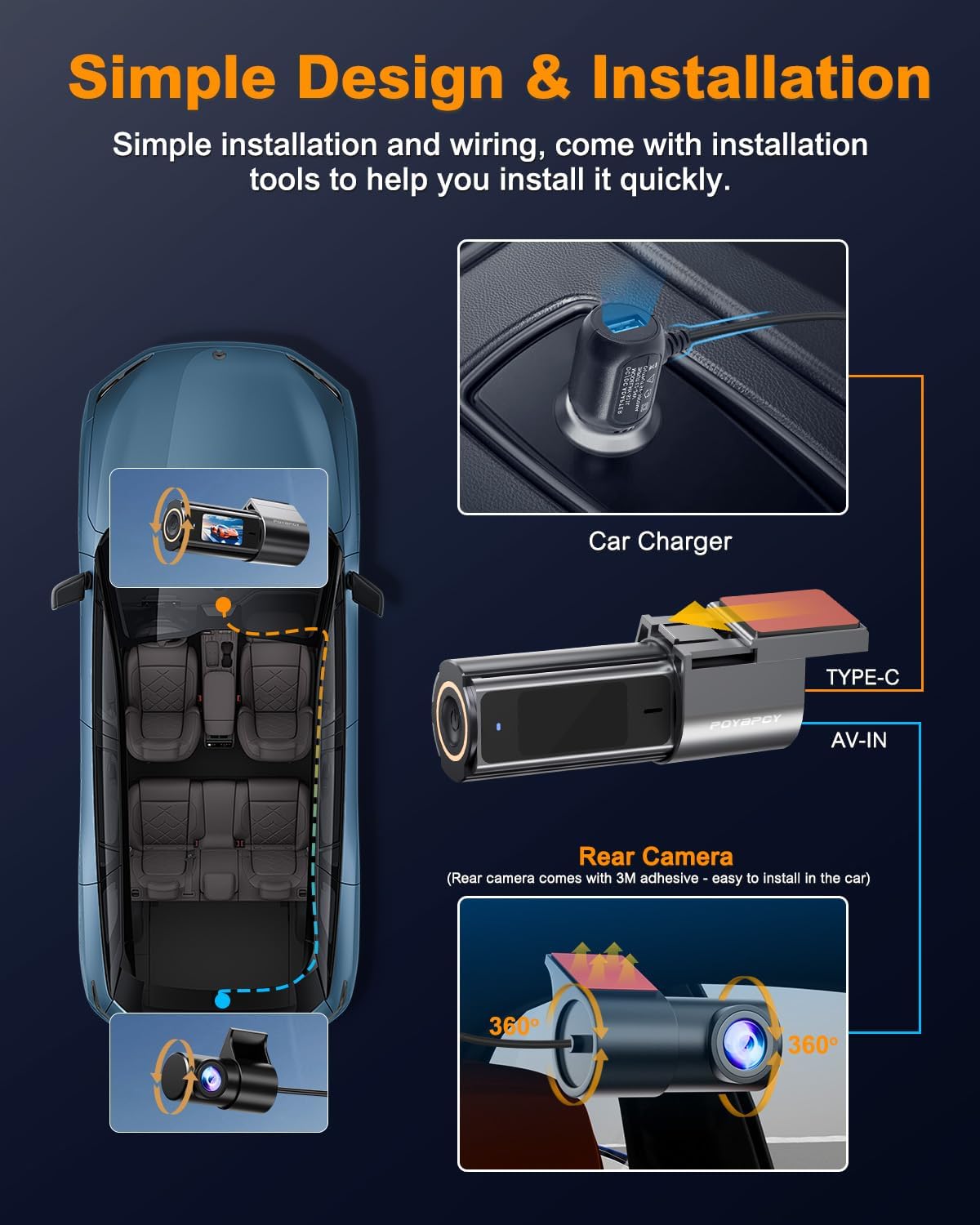 - 【360° Rotation & Built-in 5G WiFi】Easy to install. This dashcam front and rear camera can rotate 360 degrees and easily adjust to inside dash cam or any angle you want. Dash cam front and rear wireless has built-in 5G WiFi high-speed transmission and can be easily connected through the mobile phone application (available for Android and iOS). You can adjust the parameters of the car camera in the APP, and you can also view and share your video files to your social media, friends and family