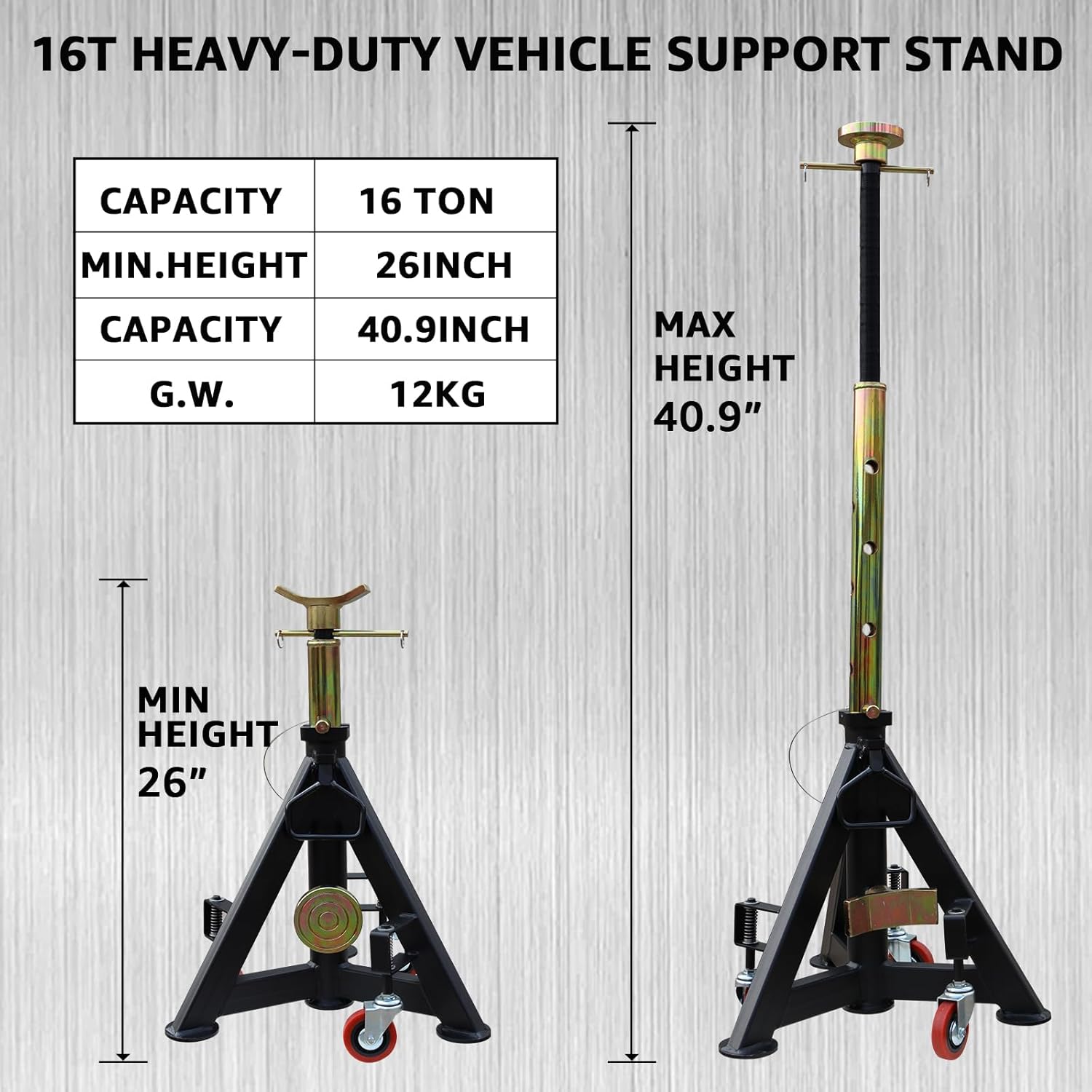 - 【 Extra-High Adjustable Range for Versatile Fit】Heavy duty jack stands easily adjustable from 26" to 40.9", this jack stand handles lifted vehicles, oversized tires, and tall chassis with ease. Whether you're working on an off-road rig or a Class A motorhome, it has the height range to match.