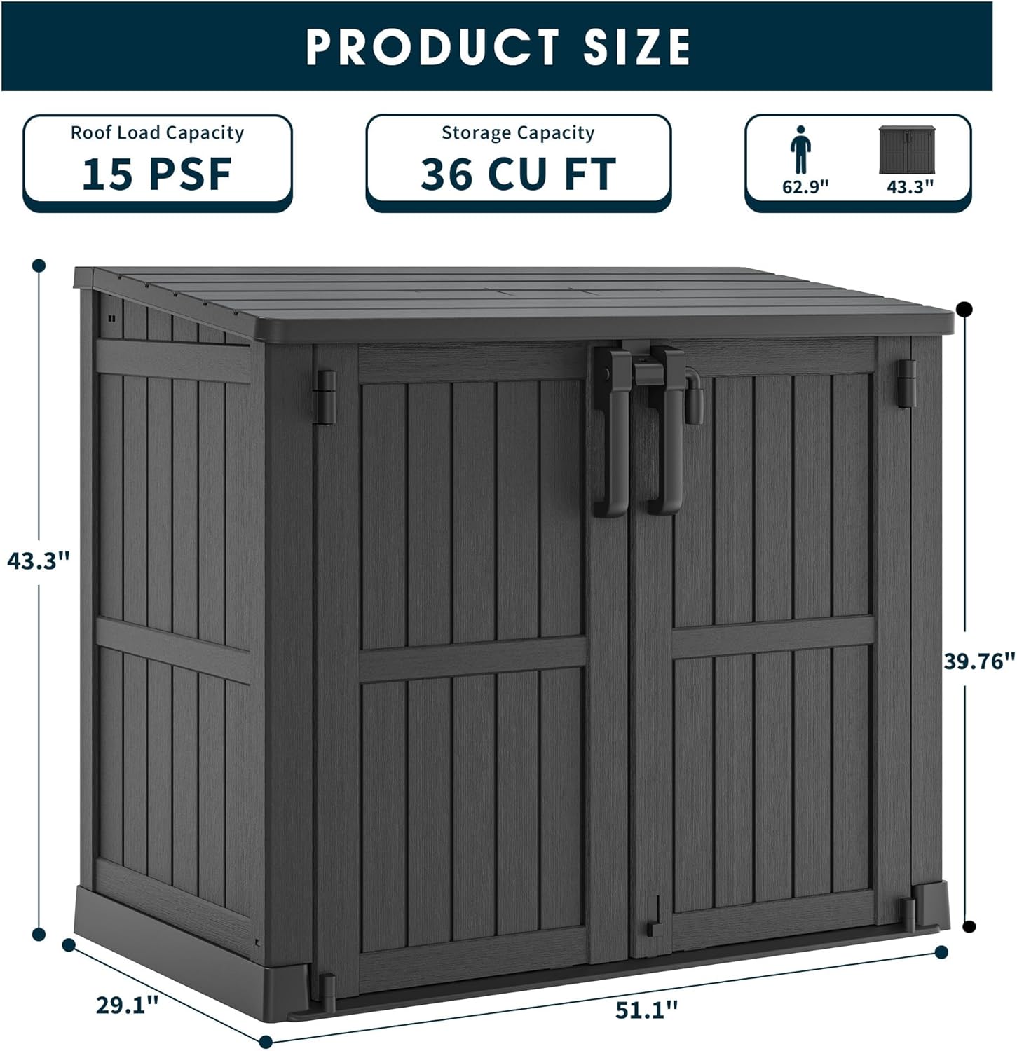 Outdoor Storage Shed 36 Cu. Ft. Resin Garden Horizontal Storage Large Capacity Weather Resistant Storage Box, Lockable Resin Waterproof Shed for Garbage Cans, Garden Tools
