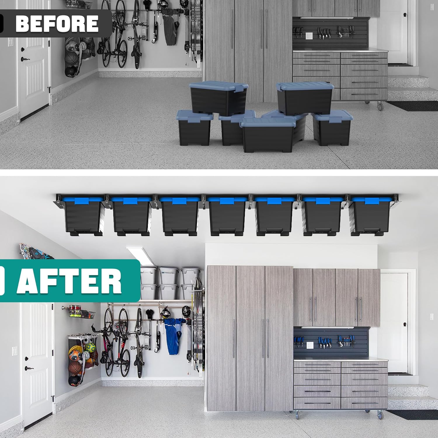 - Easy Installation: With clear instructions and all necessary hardware included, the ceiling storage system can be easily installed in your garage. Simply follow the steps to securely set up and enjoy convenient hanging storage