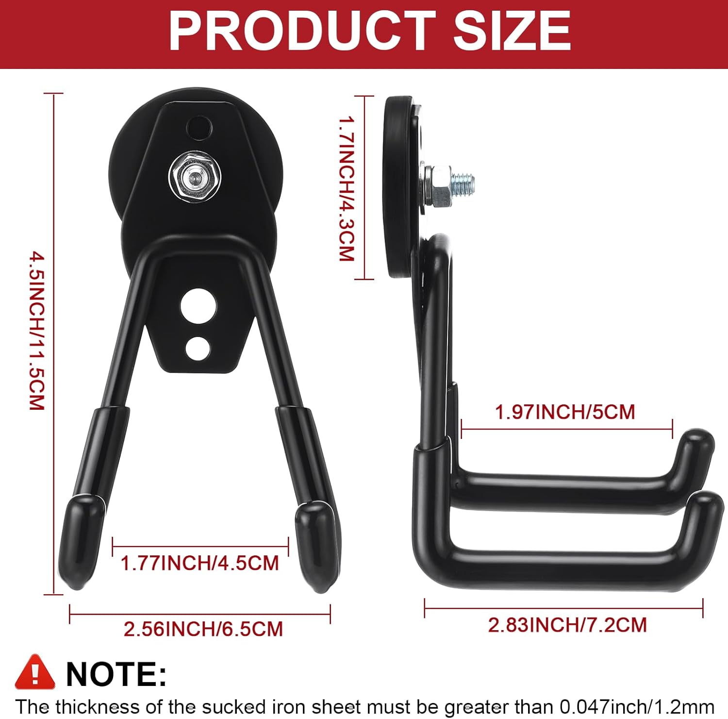 - Easy to Install: no need to use any tools, and the magnetic hooks will not break the surface; The black magnetic hooks can be placed directly on the metal surface; Please note that the thickness of the sucked iron sheet must be thicker than 0.047 inch/ 1.2 mm; Or else the magnetic hook will slide off
