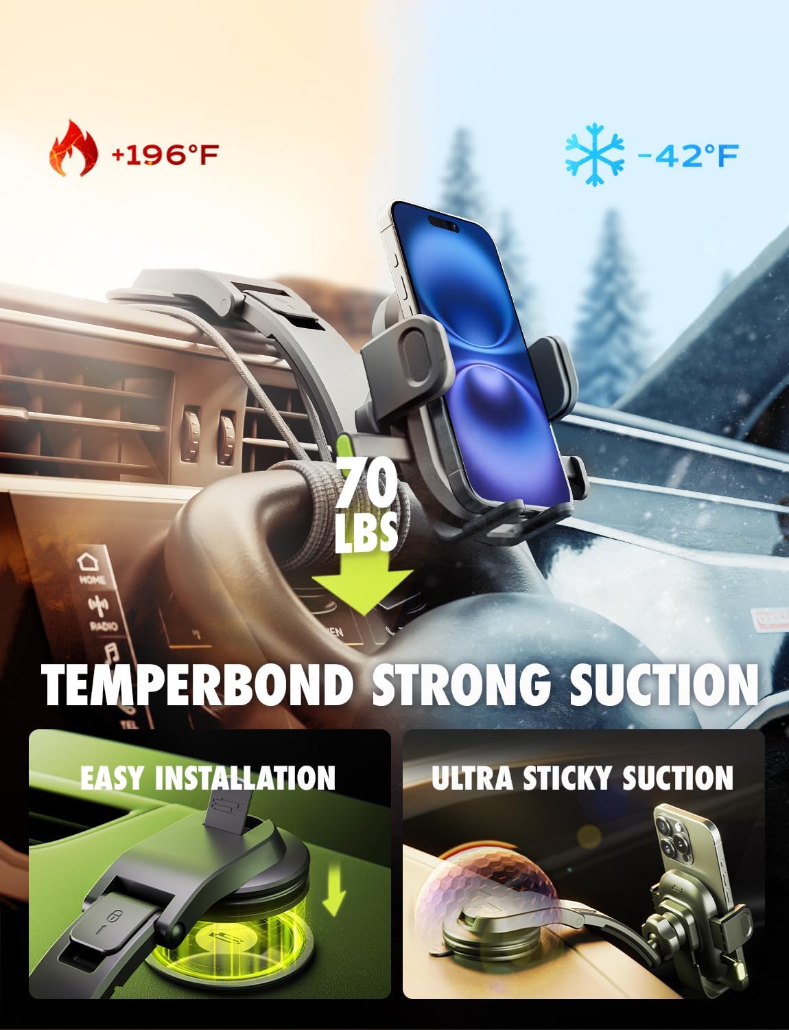 - Rock-Solid Suction - Our heavy-duty TemperBond suction cup features a triple-layer nano adhesive that delivers unmatched sticking power on flat dashboards, even during sharp turns or bumpy roads. Heat-resistant up to 196°F and cold-resistant down to -42°F, it stays firmly in place through every season. Compatible with all major smartphones, this car phone holder keeps your phone secure and your view clear.