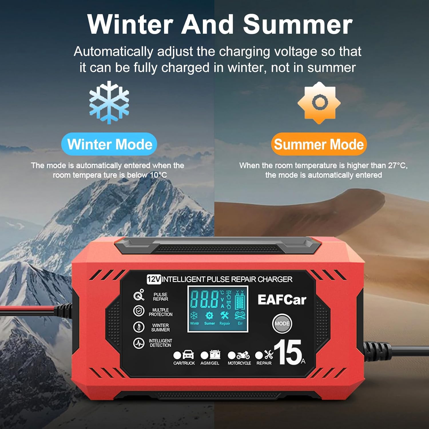 - đăLARGE LCD DISPLAY VISUALIZED CHARGINGăJust plug and play, leave the car battery charger booster there for charging and maintaining your batteries, automatically detect battery voltage, battery sulfation and acid stratification.The smart digital LCD screen of the auto battery charger displays the charging status and battery status.