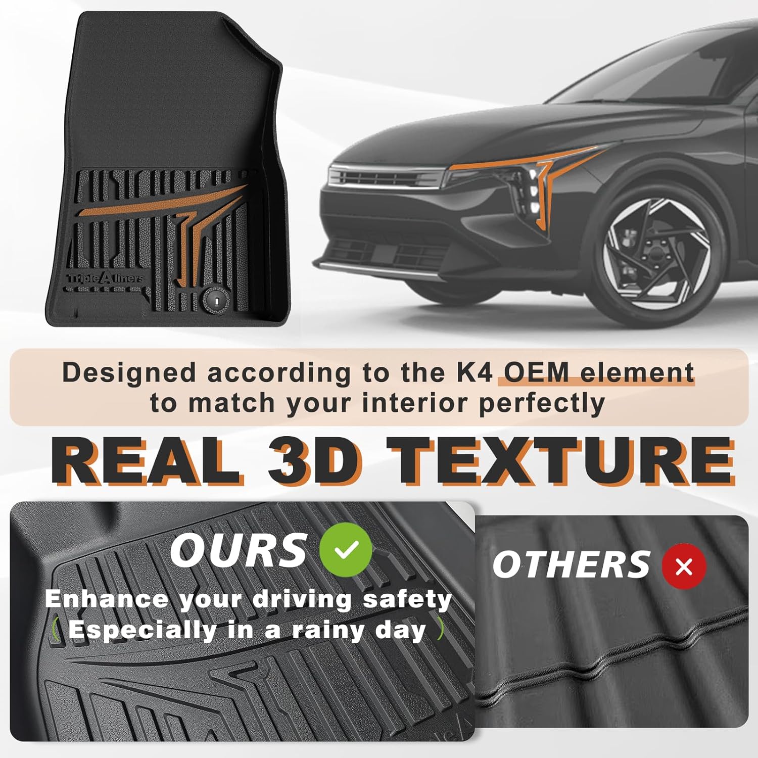 - Perfect Fitment: Custom-fit design based on 3D laser scan data to ensure a perfect flush contour and full coverage for your 2025 Kia K4 perfectly. [Package includes 1*Floor Mats Set, 1*Trunk Mat]