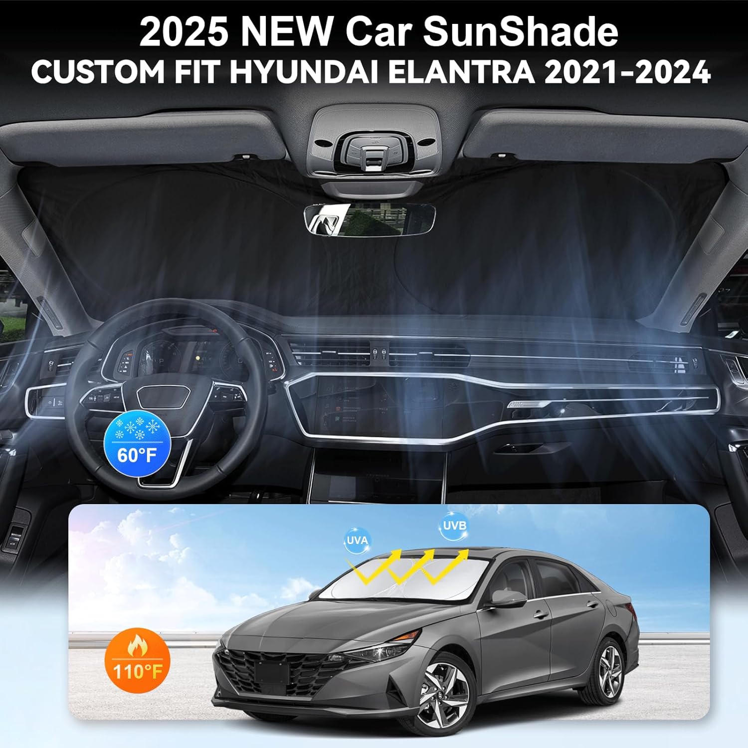 - [CUSTOM-FIT FRONT WINDSHIELD SUNSHADE] Automotive windshield sun shade is Specifically designed,which for 2021-2024 2025 Hyundai Elantra Accessories. We have several size of car sunshade. Please measure your car size and refer to our size before your purchase. Once installed it won't have gaps, sags or slumps like other car sun shade windshield