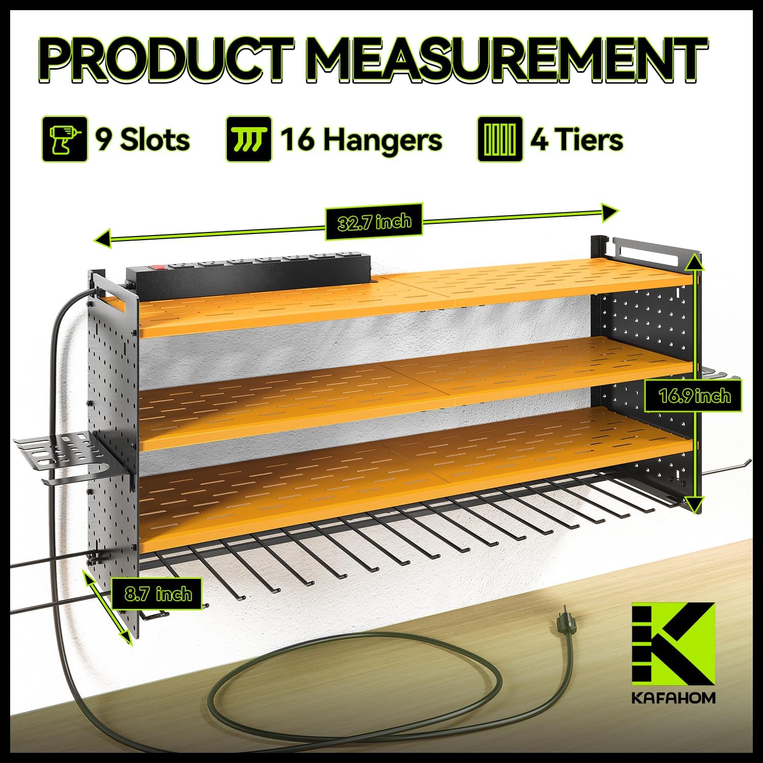KAFAHOM Power Tool Organizer with Charging Station,9 Drill Holder Wall Mount,4 Layer Durable Metal Cordless Drill Storage for Garage Organization,Battery Tool Rack Built in 7 Outlet Power Strip-Yellow