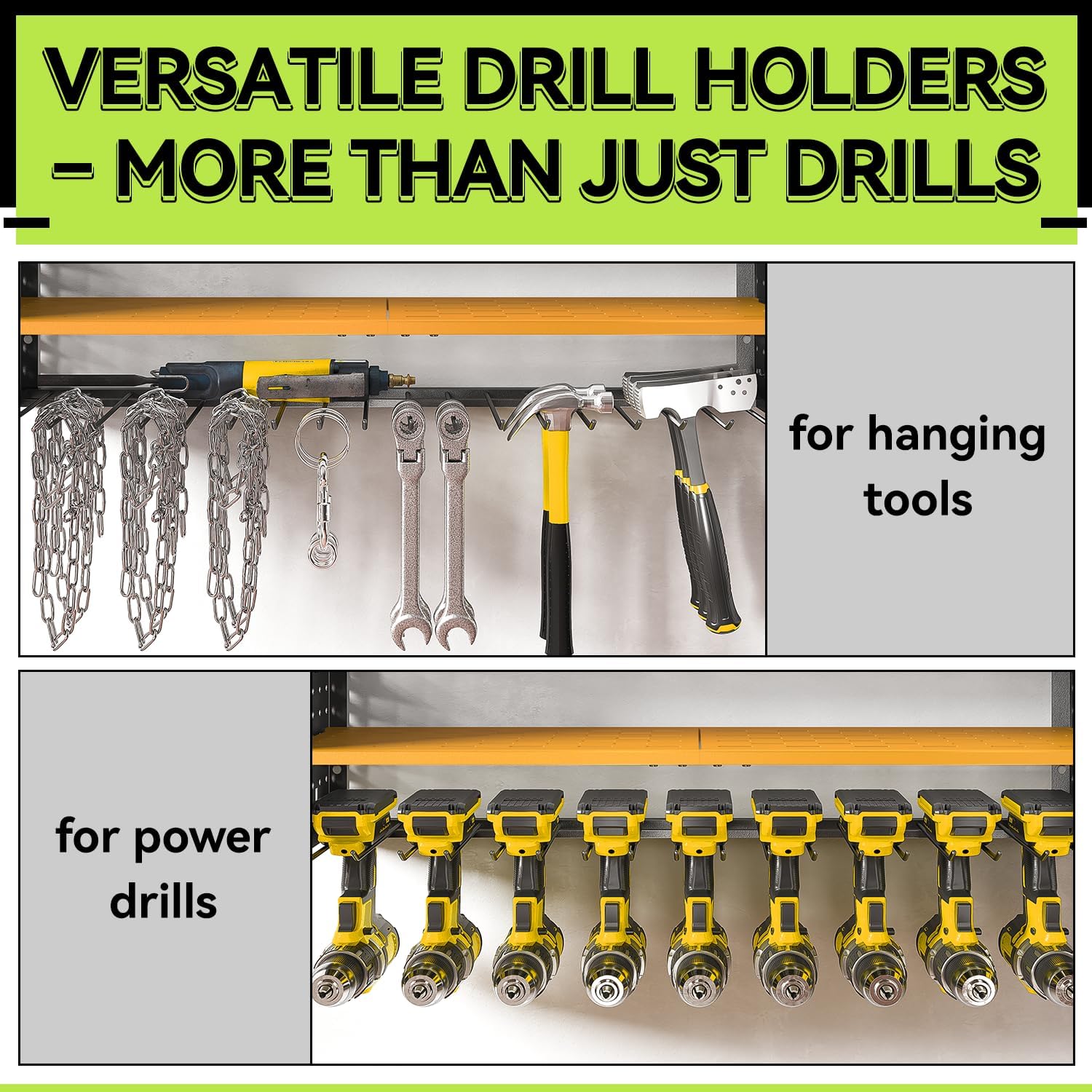 - Bottom Shelf for 9 Tools: The spacious bottom tool shelf wall storage accommodates up to 9 hand or power tools, providing ample storage for your essential equipment. Featuring J-shaped hooks, this design ensures tools are securely hung and prevents tipping and easy to access. Doubles as a handy hanger for small tools - smarter than traditional cordless tool organizer!