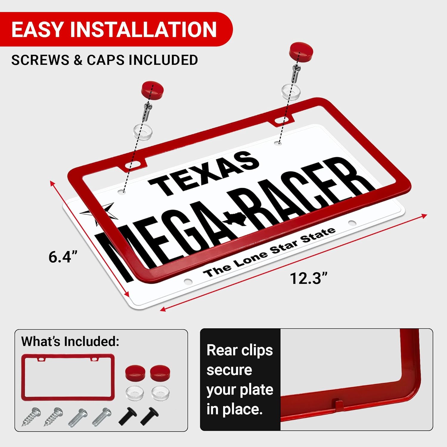 - STRONG DURABLE QUALITY: Our 1 pc License Plate Frame Red Holder is made strong to uphold anything from car washes to weather changes. Mega Racer's red license plate frames are RATTLE PROOF and RUST RESISTANT keeping your vehicle paint SCRATCH FREE.