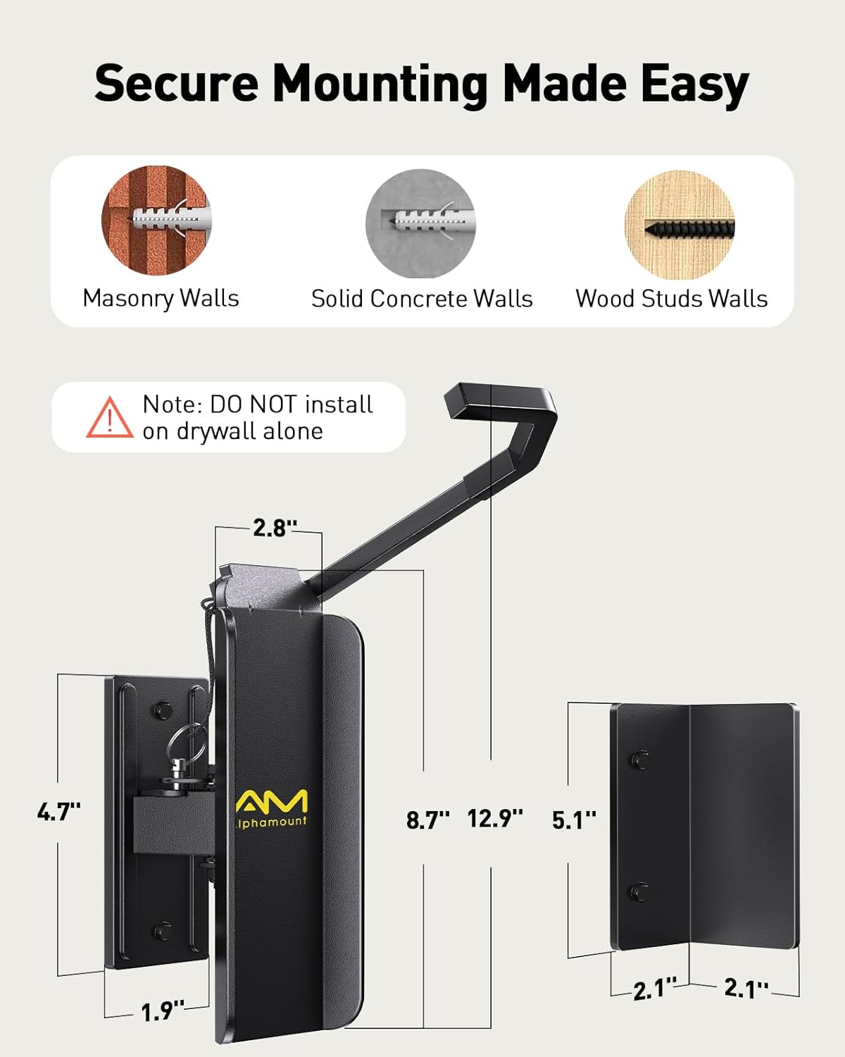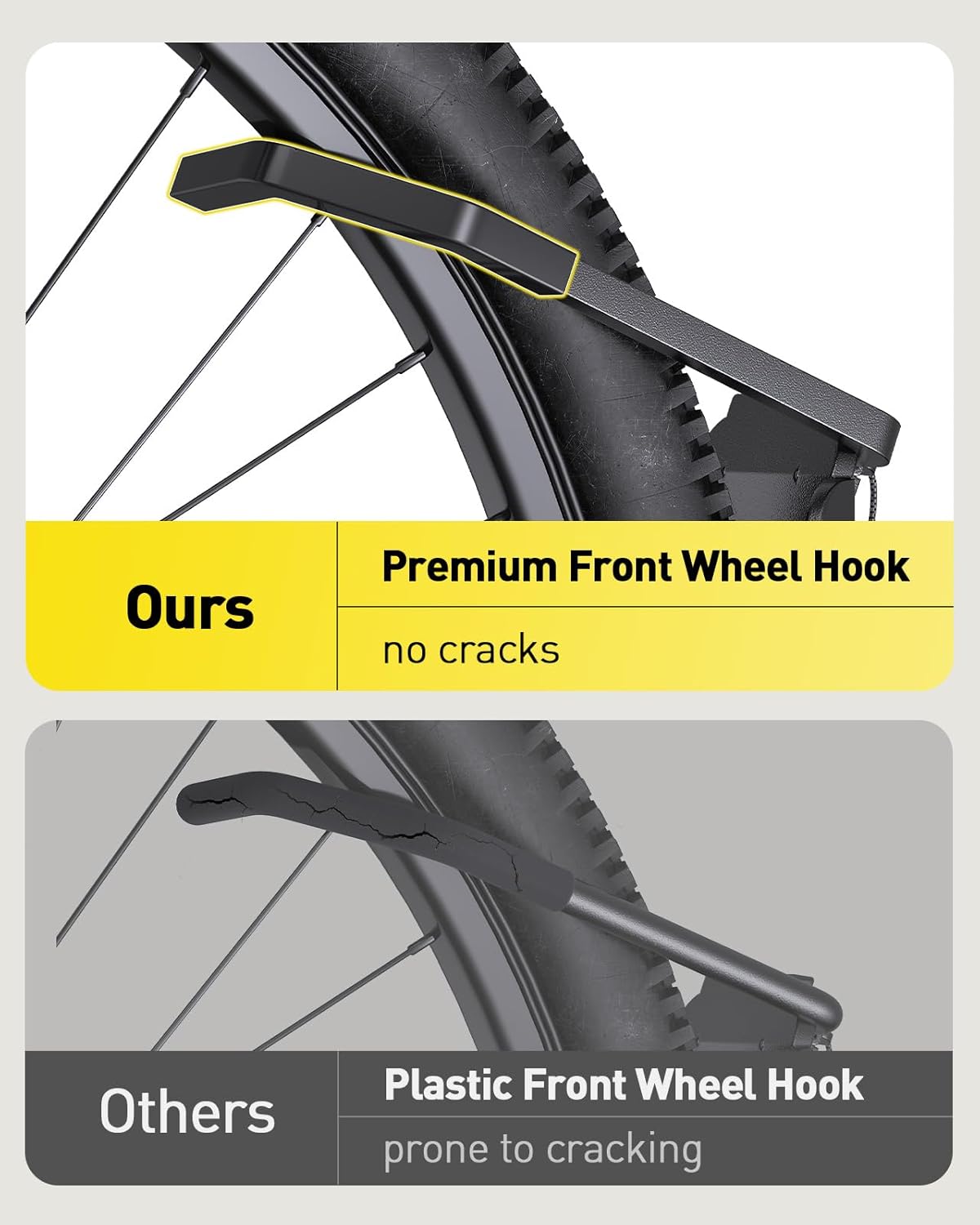 - 【Rock-Solid Metal Build】The AM Alphamount bike wall mount is designed in metal, capable of supporting up to 66 lbs and ensuring a consistently stable mount. The front wheel hook of the wall bike mount is equipped with a durable sleeve that reduces pressure on the wheel, rim, and spokes, preventing unnecessary scratches.