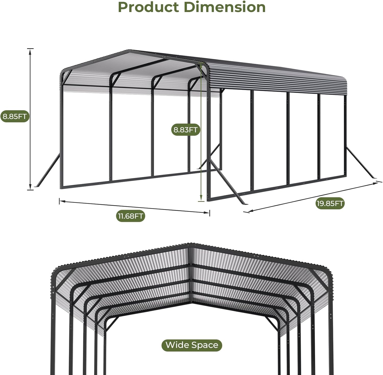 - Spacious & Versatile Design: With dimensions of 11.7'W x 19.9'D x 8.9'H, this metal carport kits provides ample space for cars, RVs, boats, or equipment, meeting various outdoor storage needs