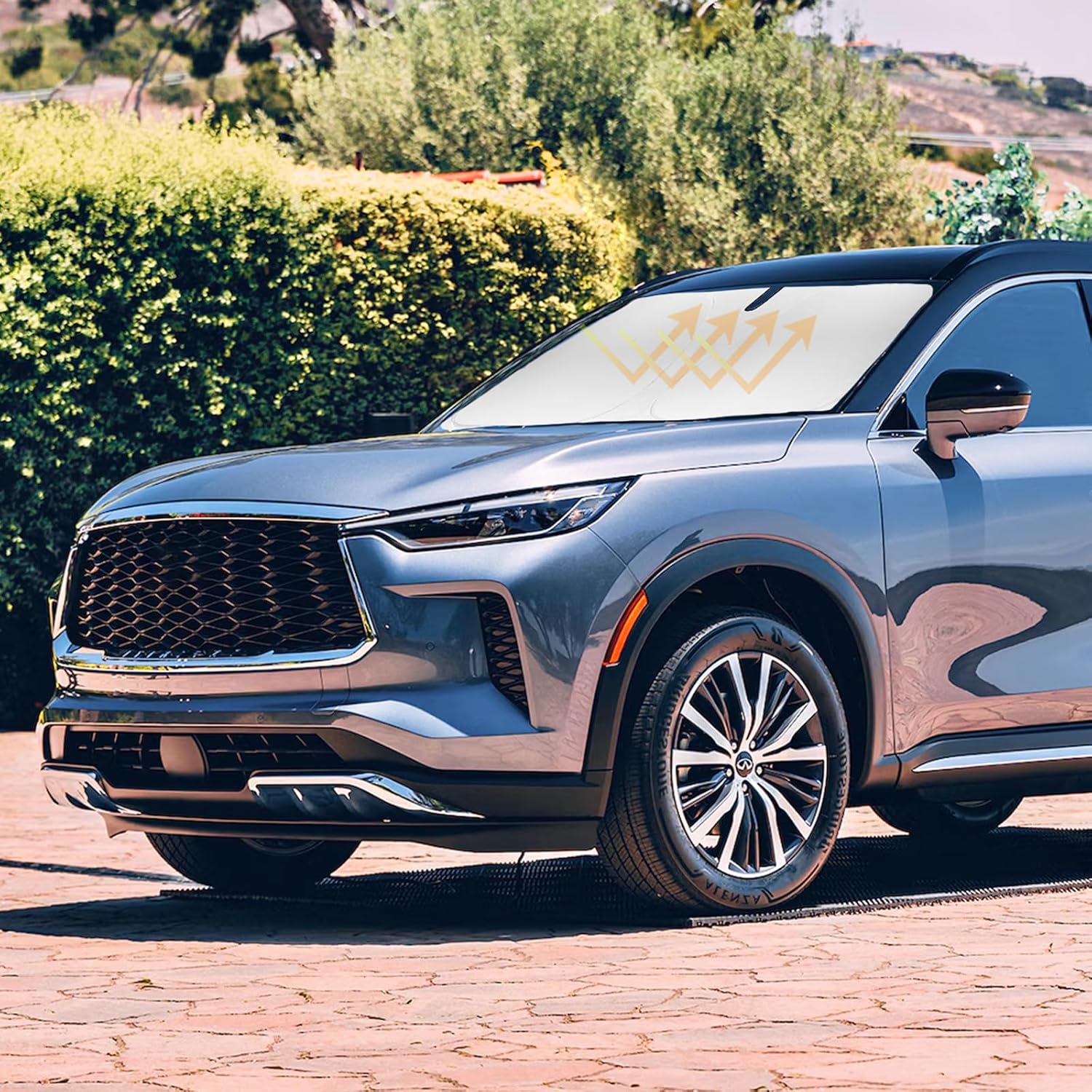 - ăVehicle SpecificăOur Windshield Shade Cover custom fit for 2014-2023 2024 2025 Infiniti QX60, Base, Sport, Hybrid, A-Spec SUV Accessories,Full covered your windshield,No Gap,100% Perfect fit. The precise fit design and reinforced steel ring are sufficient to allow the sun shade to precisely fit the front window without the need for suction cups to hold it in place, effectively protecting your car from the sun's rays.