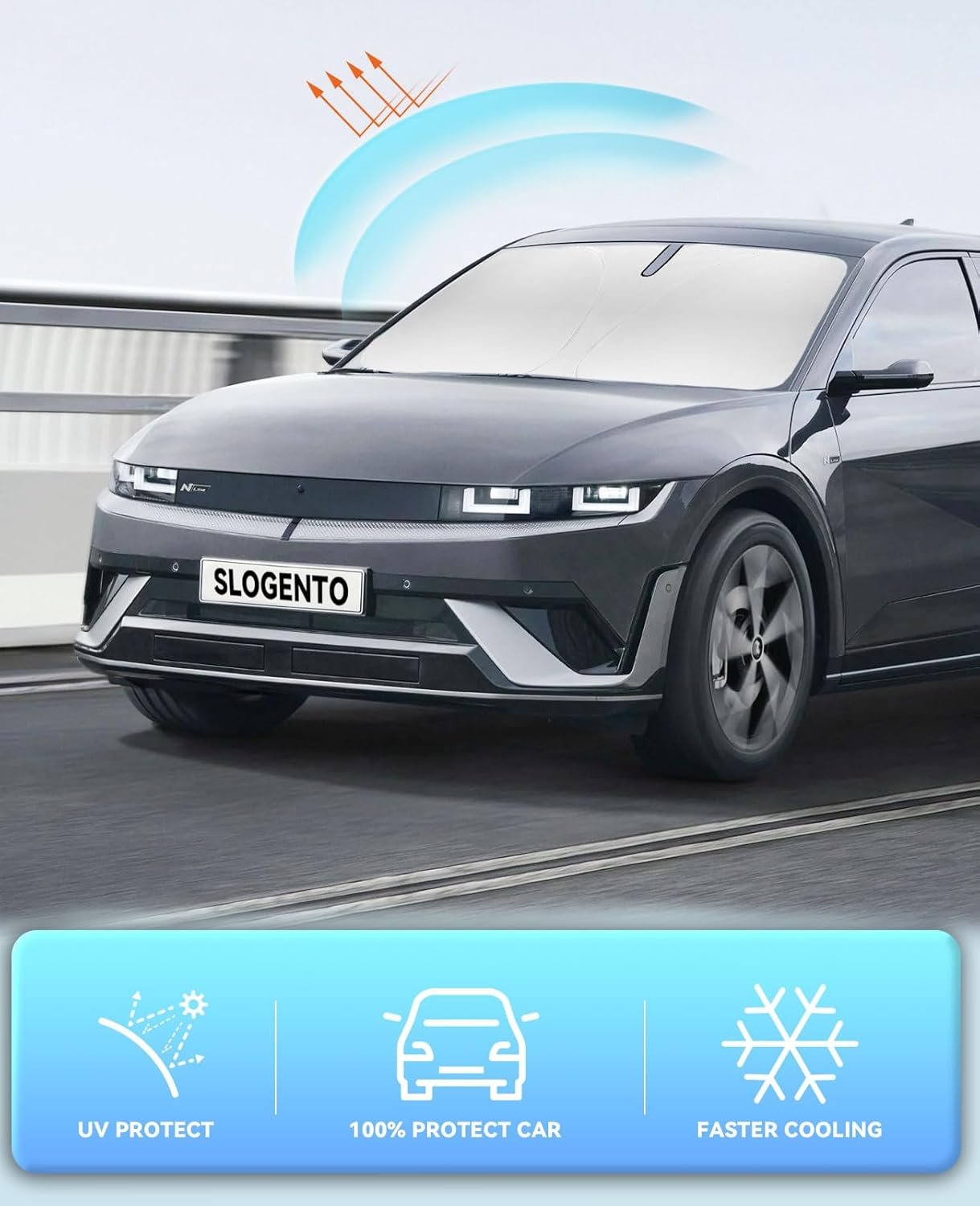 - ăVehicle SpecificăOur Windshield Shade Cover custom fit for Hyundai Ioniq 5 2022-2024 2025 Accessories ,Full covered your windshield,No Gap,100% Perfect fit. The precise fit design and reinforced steel ring are sufficient to allow the sun shade to precisely fit the front window without the need for suction cups to hold it in place, effectively protecting your car from the sun's rays.