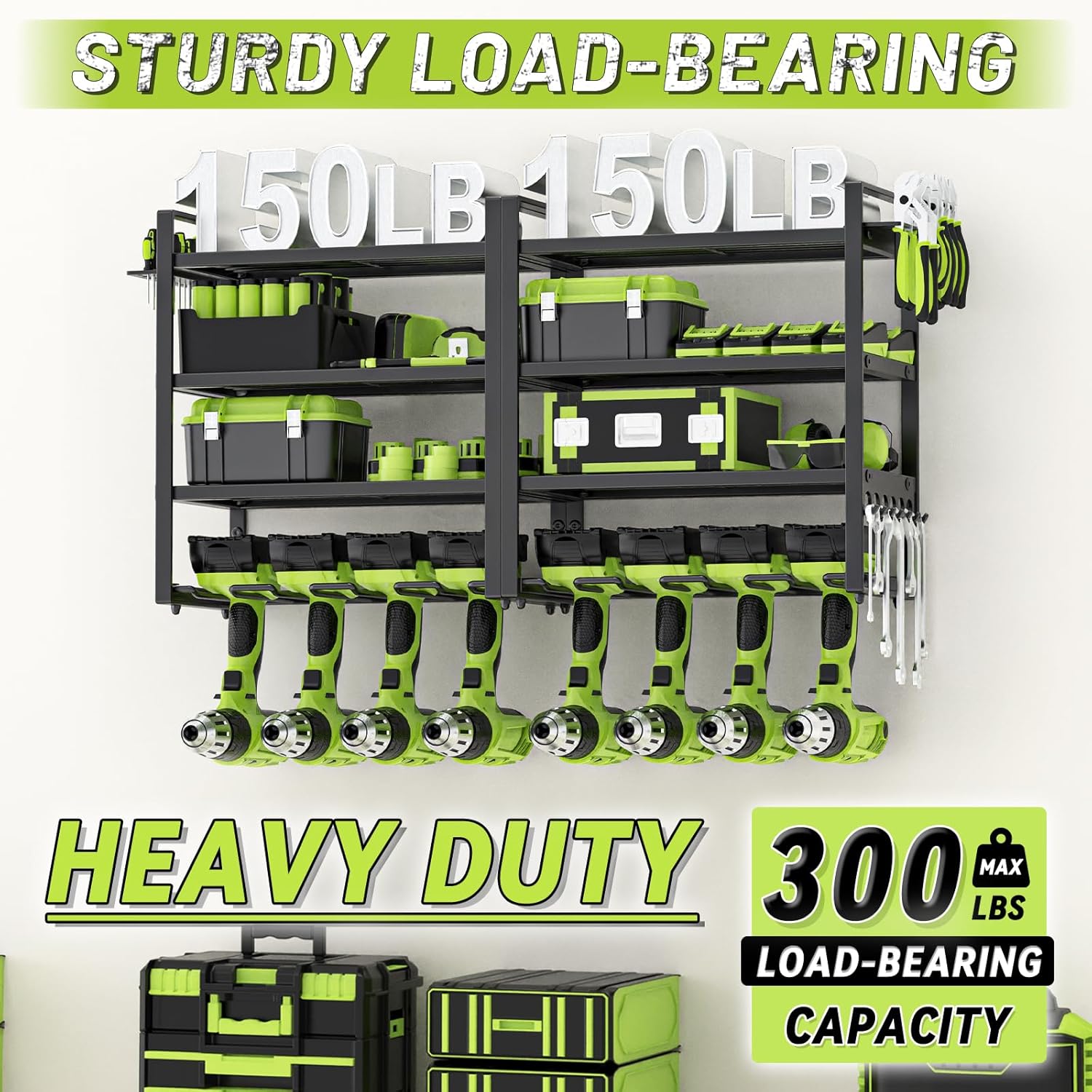 - Durable and Sturdy: The drill holder is made of heavy-duty metal with a special anti-rust and scratch-resistant coating. The edges are smoothly polished to prevent scratches. Each individual rack can support up to 150 pounds, and when combined, the rack can support up to 300 pounds
