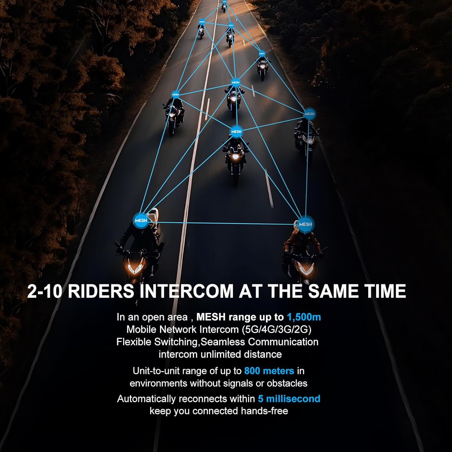 - 【Upgraded Integrated Intercom System Mesh 4.0】The helmet speakers support 2-10 people for Mesh group chat and the integration of Mesh and mobile communication. Automatically and seamlessly switch between Mesh (within 1.5km) and mobile for unrestricted long - distance communication. The upgraded Mesh 4.0 technology offers penetration in obstructed environments like tunnels, steep slopes, and small bends, with a maximum range of 1500m in open areas and about 800m in obstructed areas (distance may vary depending on the test environment)