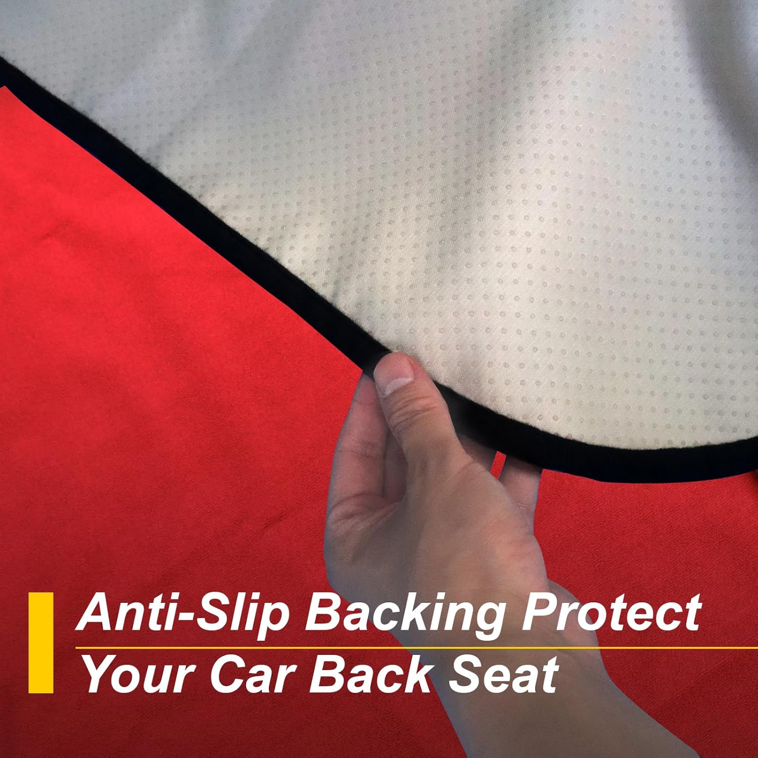 - Made From 3 Layer Material: (Front) Red towel cloth material, which gives the rear seat cover a good look and a super long life. It is perfect for leather or upholstery back seats. (Middle) Waterproof fabric that is designed to guard your backseat against moisture and sweat. (Back) This rear seat cover are designed with a non-slip backing fabric that's super comfortable and won't slip off your back seat.
